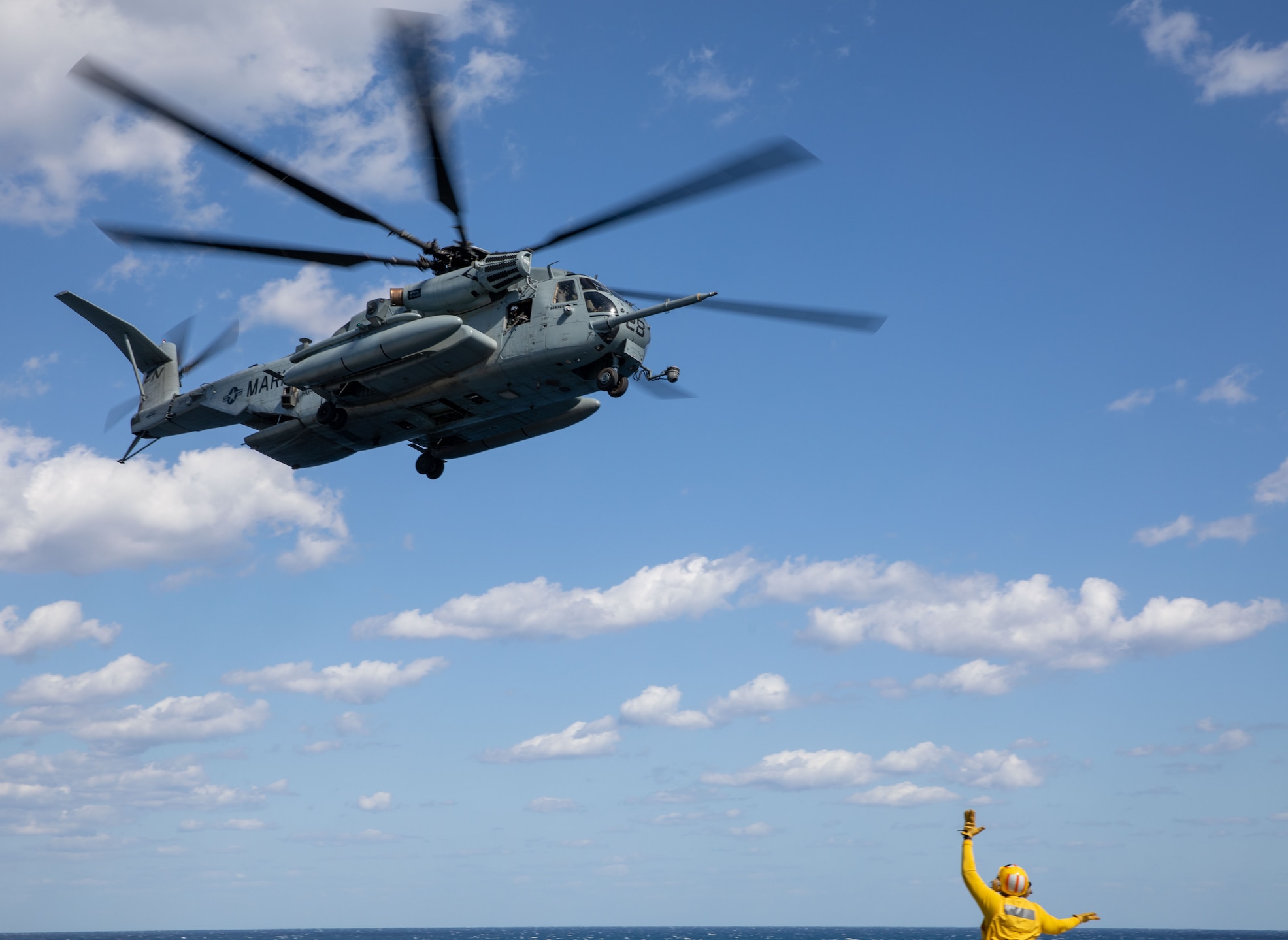 ATLANTIC OCEAN (May 2, 2023) Aviation Boatswain’s Mate (Handling) 2nd Class James Polkdinkins directs a CH-53E Super Stallion assigned to the “Condors” of Marine Heavy Helicopter Squadron (HMH) 464 during flight operations aboard the amphibious assault ship USS Wasp (LHD 1), May 2, 2023. Wasp is underway conducting Basic Phase inspections and assessments. (U.S. Navy photo by Mass Communication Specialist 2nd Class Sydney Milligan)