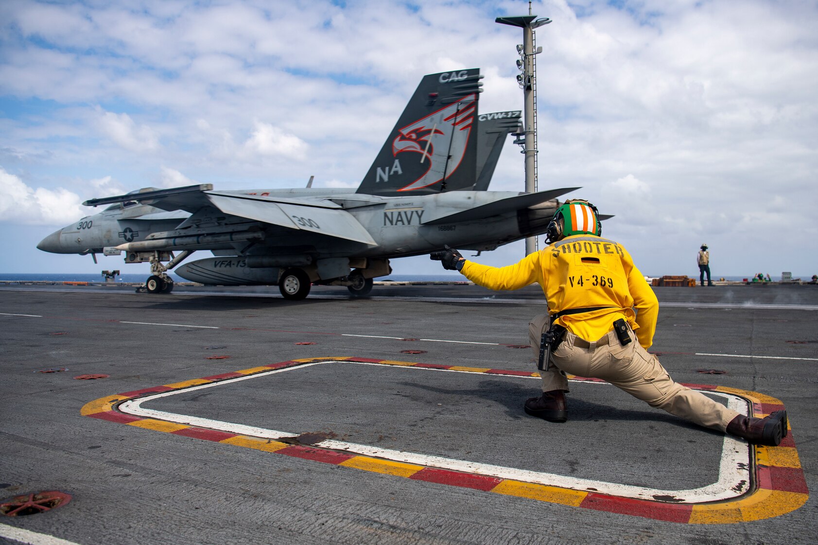 PHILIPPINE SEA (May 10, 2023) A shooter launches an F/A-18E Super Hornet from the "Kestrels" of Strike Fighter Squadron (VFA) 137 from the aircraft carrier USS Nimitz (CVN 68) during flight operations in the Philippine Sea, May 10, 2023. Nimitz is in U.S. 7th Fleet conducting routine operations. 7th Fleet is the U.S. Navy's largest forward-deployed numbered fleet, and routinely interacts and operates with allies and partners in preserving a free and open Indo-Pacific region. (U.S. Navy photo by Mass Communication Specialist 2nd Class Justin McTaggart)