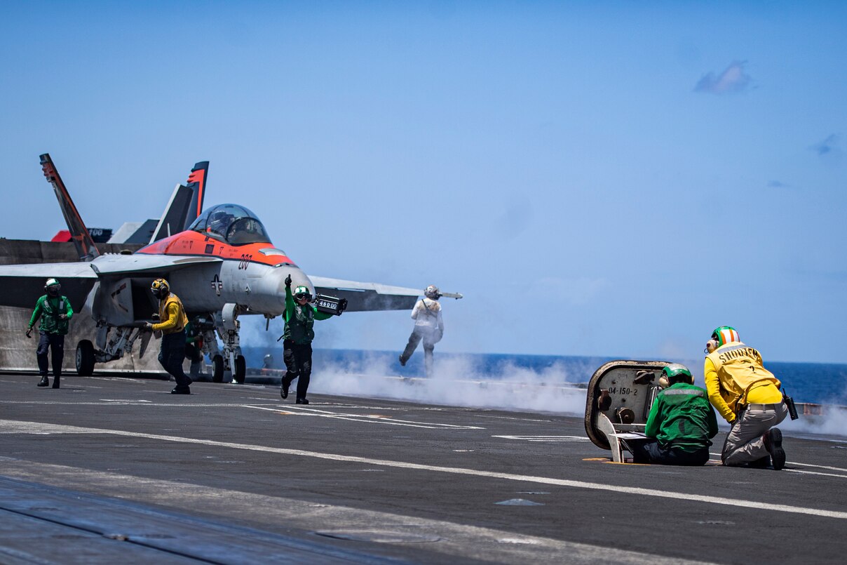 PHILIPPINE SEA (May 11, 2023) Sailors prepare an F/A-18F Super Hornet from the "Mighty Shrikes" of Strike Fighter Squadron (VFA) 94 for flight operations on the flight deck of the aircraft carrier USS Nimitz (CVN 68). Nimitz is in U.S. 7th Fleet conducting routine operations. 7th Fleet is the U.S. Navy's largest forward-deployed numbered fleet, and routinely interacts and operates with allies and partners in preserving a free and open Indo-Pacific region. (U.S. Navy photo by Mass Communication Specialist 3rd Class Hannah Kantner)