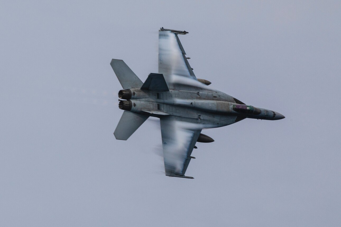 PHILIPPINE SEA (May 13, 2023) An F/A-18E Super Hornet from the "Blue Diamonds" of Strike Fighter Squadron (VFA) 146 flies above the aircraft carrier USS Nimitz (CVN 68). Nimitz is in U.S. 7th Fleet conducting routine operations. 7th Fleet is the U.S. Navy's largest forward-deployed numbered fleet, and routinely interacts and operates with allies and partners in preserving a free and open Indo-Pacific region. (U.S. Navy photo by Mass Communication Specialist 3rd Class Kevin Tang)