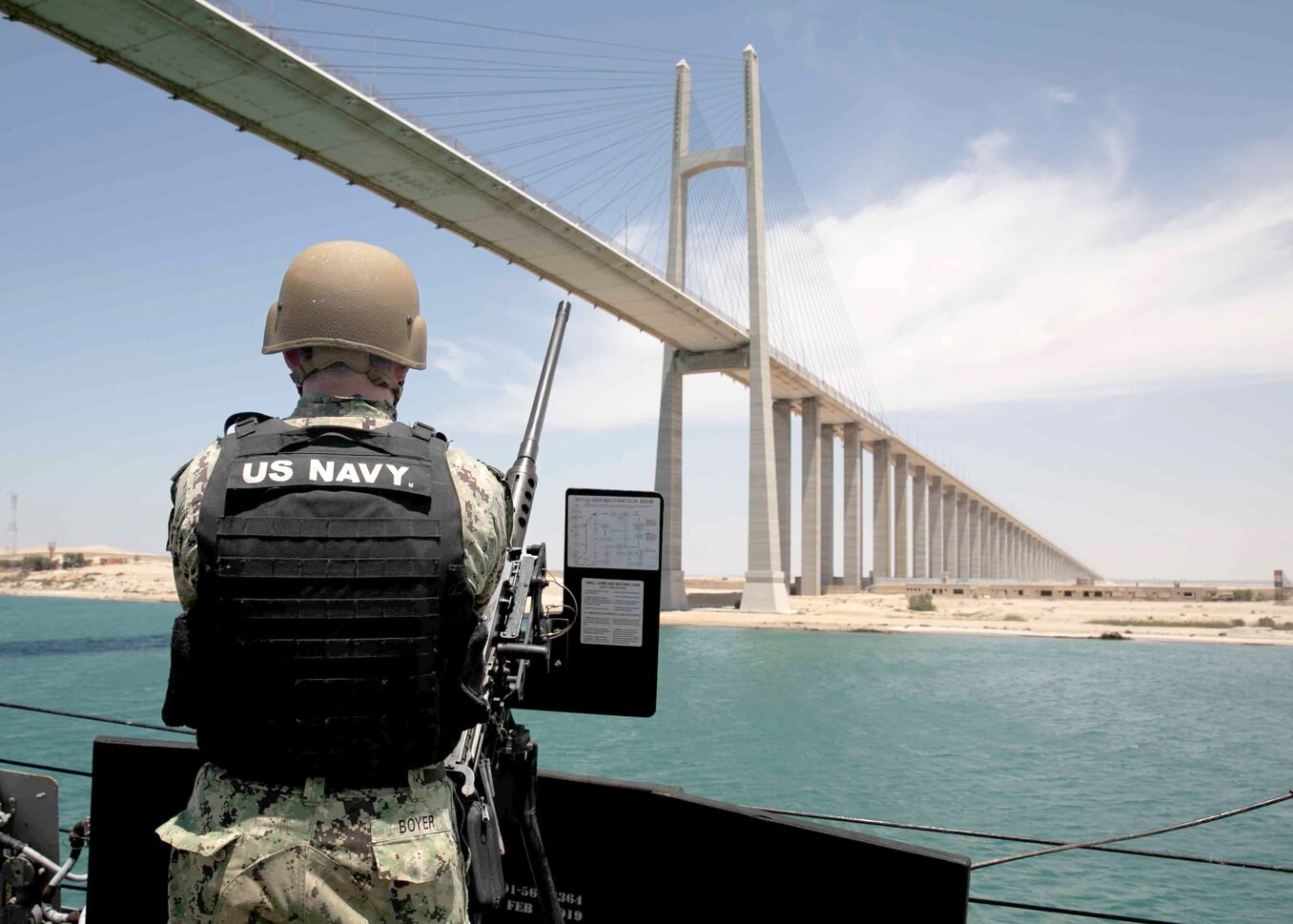 SUEZ CANAL (May 15, 2023) Gunner's Mate 2nd Class Christopher Boyer mans a .50-caliber machine gun in the forecastle of the guided-missile destroyer USS Arleigh Burke (DDG 51) as the ship passes under the Friendship Bridge while transiting the Suez Canal, May 15, 2023. Arleigh Burke is deployed to the U.S. 5th Fleet area of operations to help ensure maritime security and stability in the Middle East region. (U.S. Navy photo by Mass Communication Specialist 2nd Class Almagissel Schuring)