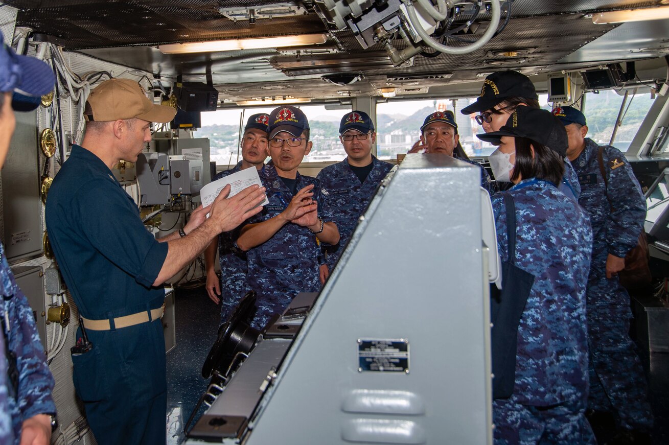 YOKOSUKA, Japan (May 22, 2023) Command Master Chief Jeremy Douglas, command master chief of the U.S. Navy's only forward-deployed aircraft carrier, USS Ronald Reagan (CVN 76), gives members of the Japan Maritime Self-Defense Force helicopter destroyer JS Izumo (DDH 183) a tour of the bridge during a ship tour while in-port at Fleet Activities Yokosuka, May 22, 2023. Ronald Reagan, the flagship of Carrier Strike Group 5, provides a combat-ready force that protects and defends the United States and supports Alliances, partnerships and collective maritime interests in the Indo-Pacific region. (U.S. Navy photo by Mass Communication Specialist 3rd Class Evan Mueller)