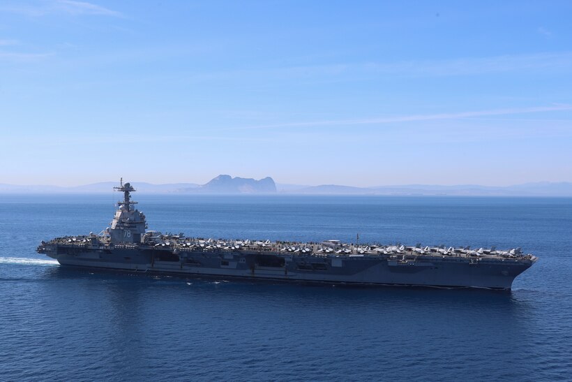 STRAIT OF GIBRALTAR (June 15, 2023) The world's largest aircraft carrier, USS Gerald R. Ford (CVN 78), transits the Strait of Gibraltar, June 15, 2023. Gerald R. Ford is the U.S. Navy's newest and most advanced aircraft carrier, representing a generational leap in the U.S. Navy's capacity to project power on a global scale. The Gerald R. Ford Carrier Strike Group is on a scheduled deployment in the U.S. Naval Forces Europe area of operations, employed by U.S. Sixth Fleet to defend U.S., allied, and partner interests. (U.S. Navy photo by Mass Communication Specialist 2nd Class Jackson Adkins)