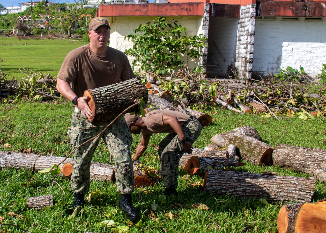 TUMON, Guam (June 18, 2023) Chief Engineman Michael Tobin, from Chicago, assigned to the littoral combat ship USS Manchester (LCS 14), participates in the cleanup of Ypao Beach Park as part of recovery efforts following Typhoon Mawar. Joint Region Marianas (JRM) is a dual-status command, comprising both Title 10 forces from U.S. Army Pacific's Task Force West and Title 32 Guam National Guard Forces in support of the Governor of Guam, are the DoD entities unified in their support to the civil authorities and the people of Guam and the Marianas during Typhoon Mawar response recovery. (U.S. Navy photo by Mass Communication Specialist 2nd Class Chase Sealey)