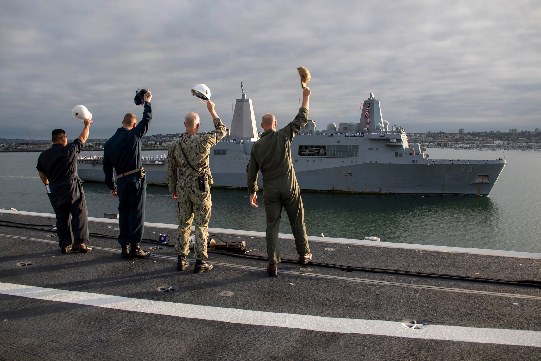 SAN DIEGO (June 8, 2023) Capt. Pete Riebe, commanding officer of the Nimitz-class aircraft carrier USS Abraham Lincoln (CVN 72), and Sailors aboard the ship wave as the San Antonio-class amphibious transport dock USS Anchorage (LPD 23) sails through San Diego Bay upon return to homeport following a seven-month deployment. The Makin Island Amphibious Ready Group, comprised of amphibious assault ship USS Makin Island (LHD 8) and the amphibious transport docks Anchorage and USS John P. Murtha (LPD 26), with the embarked 13th Marine Expeditionary Unit, participated in multiple training exercises with international partners while deployed in support of regional stability and a free and open Indo-Pacific. (U.S. Navy photo by Mass Communication Specialist 2nd Class Madison Cassidy)