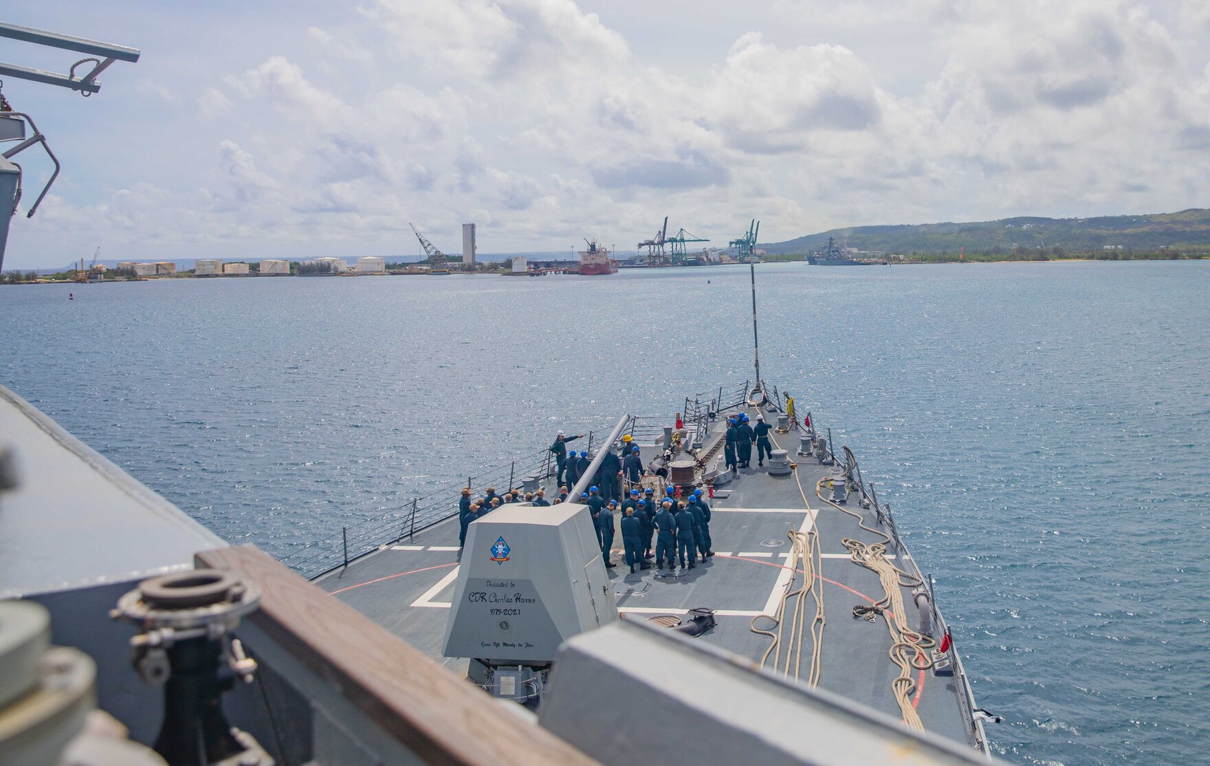 APRA HARBOR (July 1, 2023) The Arleigh Burke-class guided-missile destroyer USS Howard (DDG 83) arrives in Naval Base Guam for a scheduled port visit, July 1, 2023. Howard is assigned to Commander, Task Force 71/ Destroyer Squadron (DESRON) 15, the Navy's largest and forward-deployed DESRON and the U.S. 7th Fleet's principal surface force. (U.S. Navy photo by Mass Communication Specialist 3rd Class Santiago Navarro)
