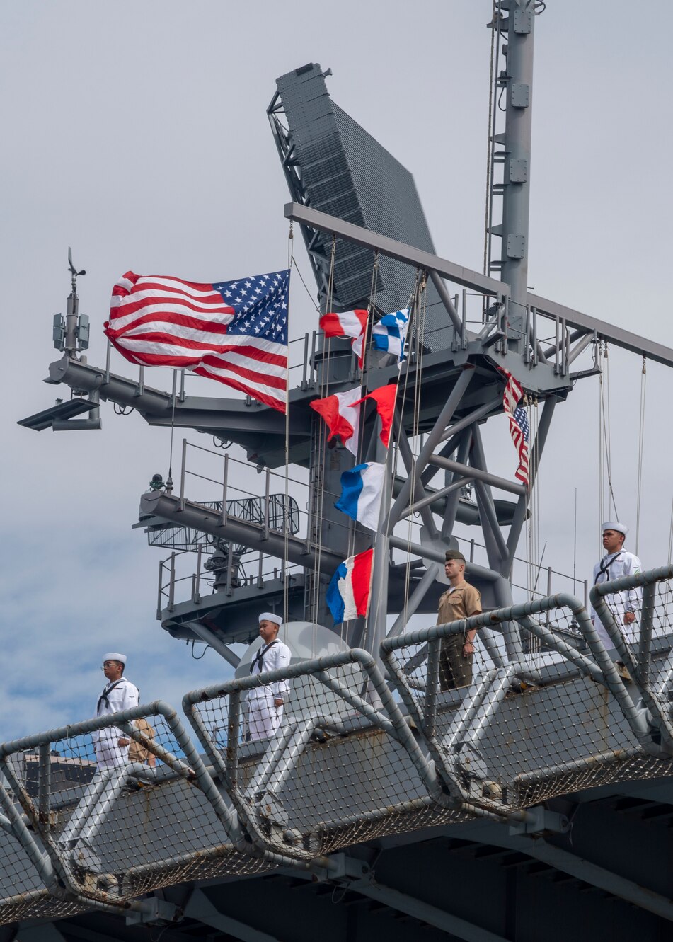 NORFOLK (July 10, 2023) Sailors and Marines man the rails as the amphibious assault ship USS Bataan (LHD 5) departs Naval Station Norfolk for a scheduled deployment, July 10, 2023. Marines and Sailors from the Bataan Amphibious Ready Group/26th Marine Expeditionary Unit (MEU) departed Norfolk, Virginia, and Camp Lejeune, North Carolina. after completing a comprehensive, nine-month training program. (U.S. Navy photo by Mass Communication Specialist 3rd Class Manvir Gill)