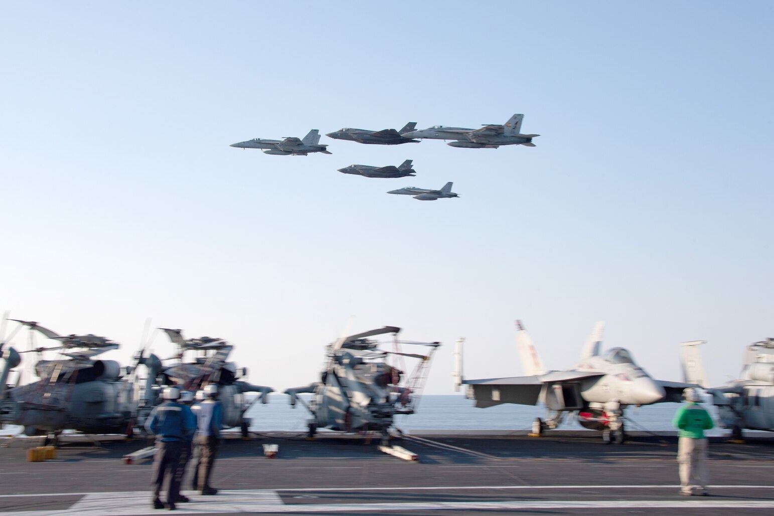 ADRIATIC SEA (July 10, 2023) F/A-18 Hornets attached to Carrier Air Wing (CVW) 8 and Italian F-35 Lightning Its fly in formation near the world's largest aircraft carrier USS Gerald R. Ford (CVN 78), July 10, 2023. CVW-8 is deployed aboard Gerald R. Ford as part of the Gerald R. Ford Carrier Strike Group (GRFCSG). Gerald R. Ford is the Navy’s newest and most advanced aircraft carrier, representing a generational leap in the U.S. Navy’s capacity to project power on a global scale. GRFCSG is on a scheduled deployment in the U.S. Naval Forces Europe area of operations, employed by U.S. Sixth Fleet to defend U.S., allied, and partner interests. GRFCSG is participating in Neptune Strike, a multiyear effort focused on harmonizing U.S. and NATO planning teams to transfer command and control of Allied naval and amphibious forces to STRIKFORNATO, in order to provide assurance, deterrence, and collective defense for the Alliance. (U.S. Navy photo by Mass Communication Specialist 2nd Class Jennifer Newsome)