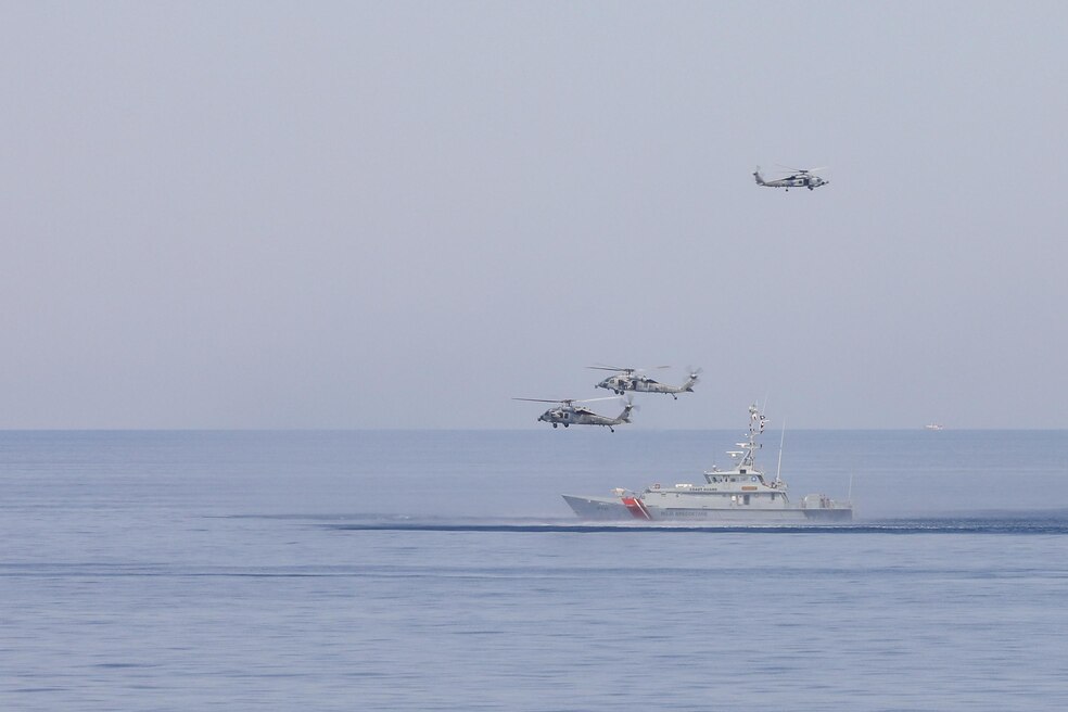 ADRIATIC SEA (July 11, 2023) U.S. Navy MH-60 Sea Hawk helicopters from the Arleigh Burke-class guided-missile destroyer USS Ramage (DDG61) fly over the Albanian coast guard Iliria-class patrol vessel ALS Lissus (P-133) during a helicopter visit, board, search and seizure exercise in the Adriatic Sea, July 11, 2023. Ramage is part of the Gerald R. Ford Carrier Strike Group and is on a scheduled deployment in the U.S. Naval Forces Europe area of operations, employed by U.S. Sixth Fleet to defend U.S., allied, and partner interests. GRFCSG is currently participating in Neptune Strike, a multiyear effort focused on harmonizing U.S. and NATO planning teams to transfer command and control of Allied naval and amphibious forces to STRIKFORNATO, in order to provide assurance, deterrence, and collective defense for the Alliance. (U.S. Navy photo by Mass Communication Specialist 3rd Class Adriones Johnson)