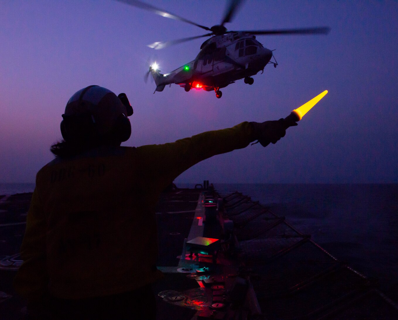 GULF OF OMAN (July 22, 2023) Cryptologic Technician (Collection) 1st Class Lynea Arriaga signals to an H225 Super Puma helicopter on the flight deck of the guided-missile destroyer USS Paul Hamilton (DDG 60) in the Gulf of Oman, July 22, 2023. Paul Hamilton is deployed to the U.S. 5th Fleet area of operations to help ensure maritime security and stability in the Middle East region. (U.S. Navy photo by Mass Communication Specialist 2nd Class Elliot Schaudt)
