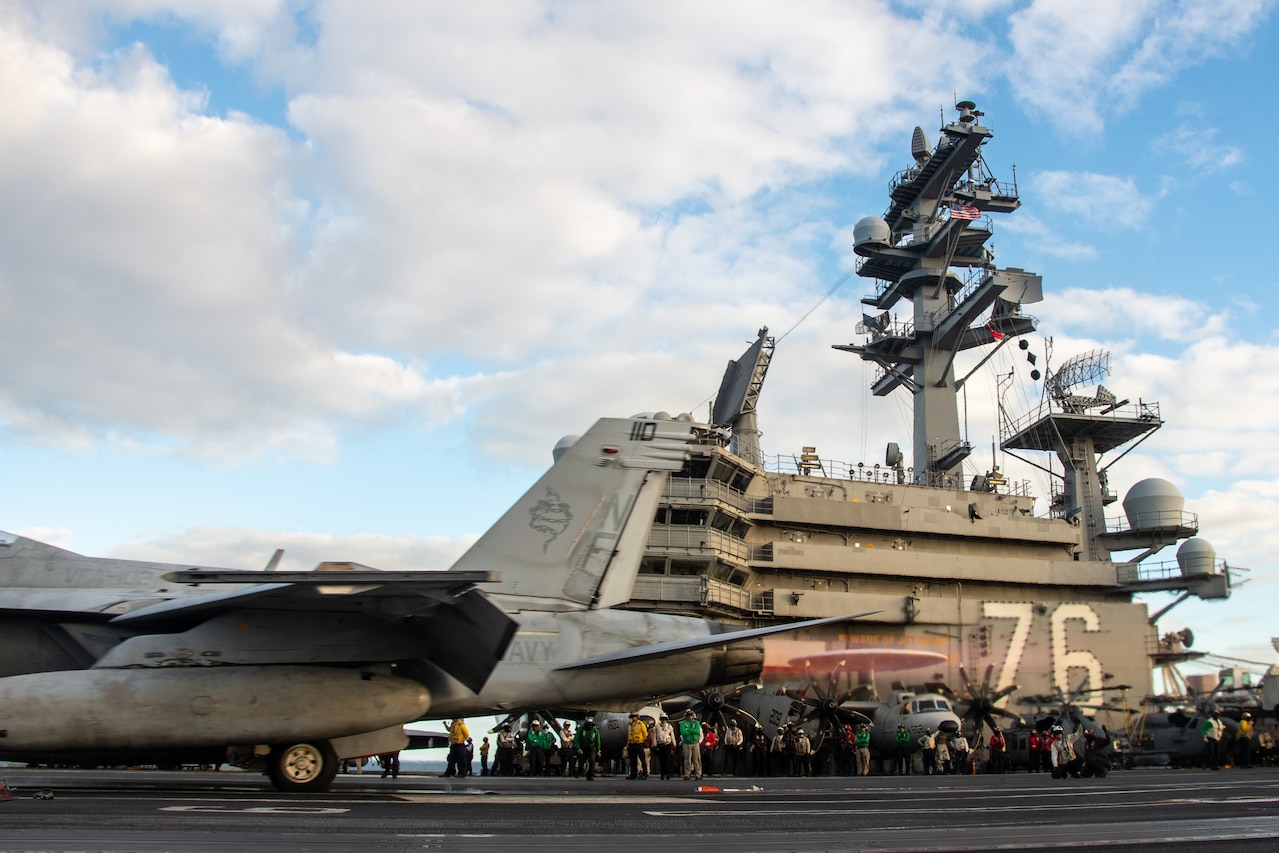 INDIAN OCEAN (July 25, 2023) An F/A-18F Super Hornet, attached to the Diamondbacks of Strike Fighter Squadron (VFA) 102 launches from the flight deck of the U.S. Navy's only forward-deployed aircraft carrier, USS Ronald Reagan (CVN 76), during flight operations in support of Exercise Talisman Sabre 23, in the Indian Ocean, July 25, 2023. Ronald Reagan, the flagship of Carrier Strike Group 5, provides a combat-ready force that protects and defends the United States, and supports alliances, partnerships and collective maritime interests in the Indo-Pacific region. Talisman Sabre is the largest bilateral military exercise between Australia and the United States advancing a free and open Indo-Pacific by strengthening relationships and interoperability among key Allies and enhancing our collective capabilities to respond to a wide array of potential security concerns. (U.S. Navy photo by Mass Communication Specialist 2nd Class Caleb Dyal)