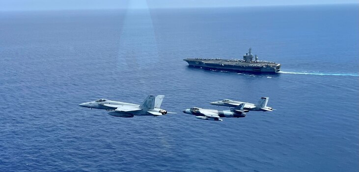 ATLANTIC OCEAN (July 14, 2023) Two F/A-18E Super Hornets and a Hawker Hunter aircraft (center) fly near the USS Dwight D. Eisenhower (CVN 69) during Carrier Strike Group (CSG) Two, Dwight D. Eisenhower CSG's composite training unit exercise (COMPTUEX). COMPTUEX is an intense, multi-week exercise designed to fully integrate a carrier strike group as a cohesive, multi-mission fighting force and to test their ability to carry out sustained combat operations from the sea. (U.S. Navy photo by Lt. Paige Westoby)