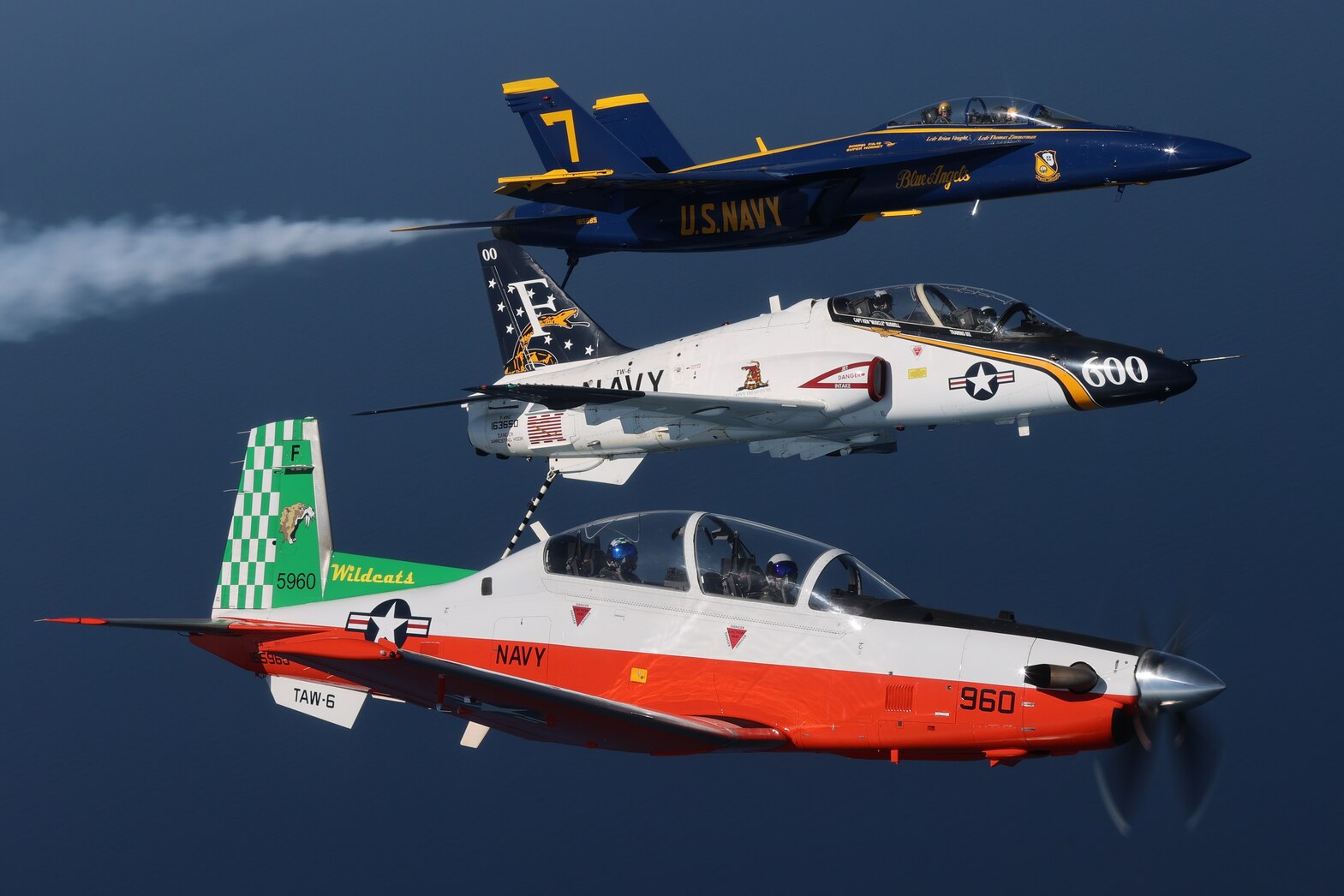 PENSACOLA, Fla. (July 26, 2023) A T-6A Texan II assigned to the “Wildcats” of Training Squadron (VT) 10, a T-45C Goshawk assigned to the “Sabrehawks” of VT-86 and a F/A-18F Super Hornet assigned to the U.S. Navy Flight Demonstration Squadron the Blue Angels fly in formation over the Gulf of Mexico, south of Pensacola, Florida, July 26, 2023. VT-10 and VT-86 are two of the Navy’s premier Naval Flight Officer (NFO) training squadrons assigned to the Chief of Naval Air Training (CNATRA). In addition, CNATRA oversees the operations of the Blue Angels. CNATRA’s mission is to train, mentor and deliver the highest quality Naval Aviators who prevail in crisis, competition and conflict. (U.S. Navy photo by Lt. Antonio “Gemma” Moré)