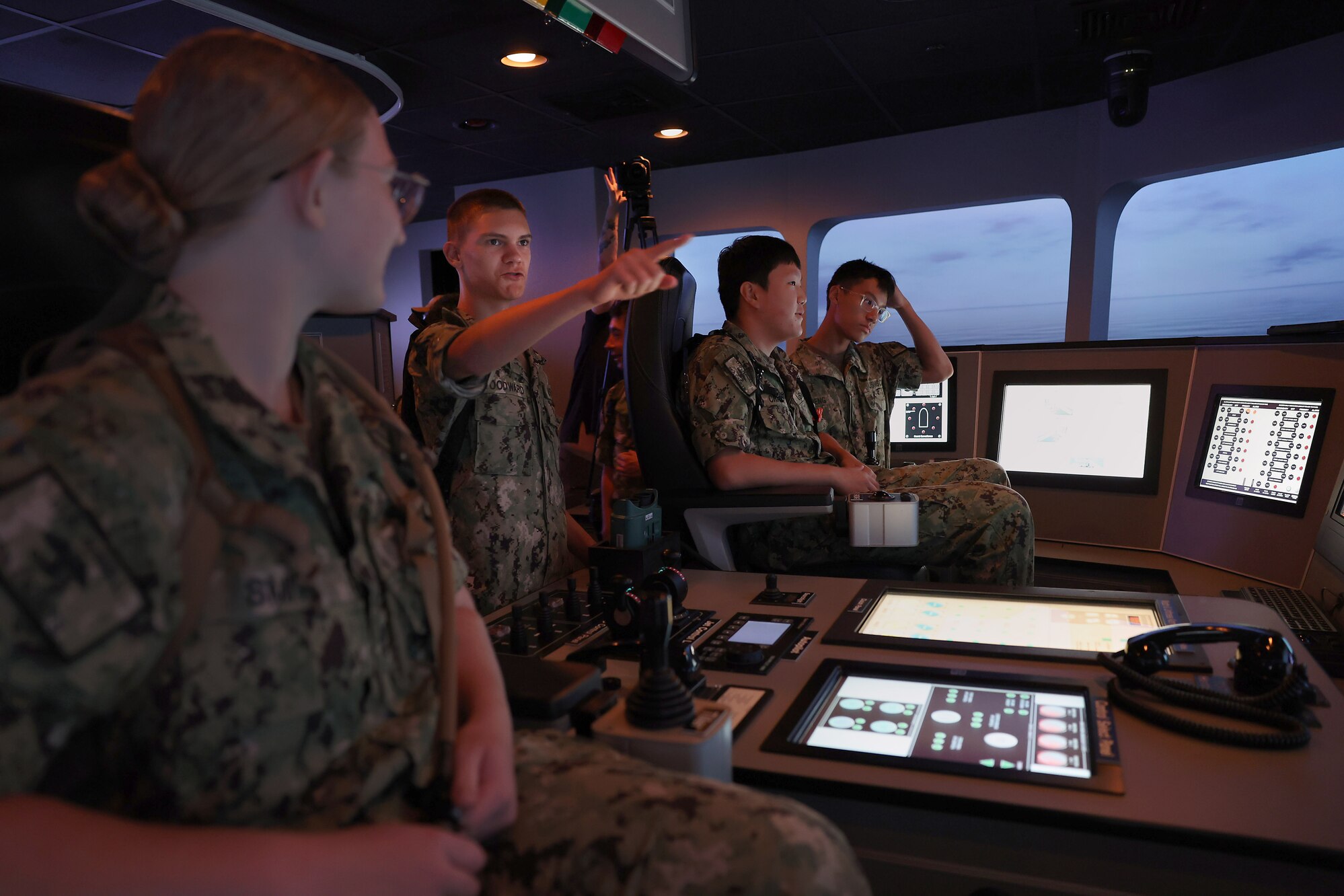 NORFOLK (July 25, 2023) U.S. Naval Sea Cadets learn to drive an Expeditionary Fast Transport (EPF) vessel in the EPF simulator at Military Sealift Command Training Center Hampton Roads, located on Joint Base Langley-Fort Eustis. MSC hosted 18 sea cadets for a weeklong visit to its training centers and Fleet Replenishment Oiler USNS Laramie (T-AO 203) to learn about the command's mission and capabilities. (U.S. Navy photo by Hendrick L. Dickson)