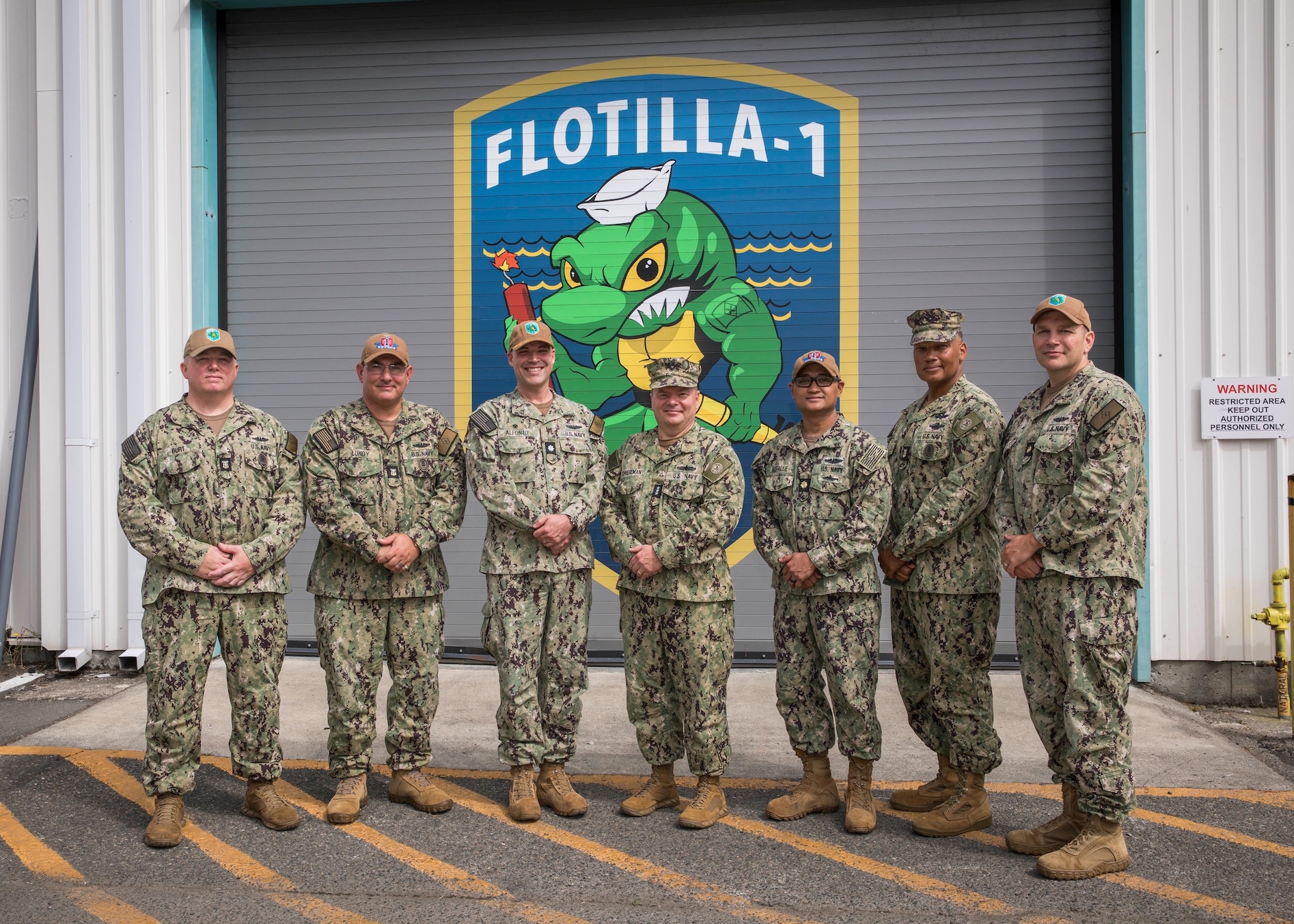 KEYPORT, Wash. (Aug. 8, 2023) – Command leaders of Unmanned Undersea Vehicle (UUV) Flotilla 1 and UUV Squadron 1 (UUVRON-1) stand with Chief of Naval Personnel Vice Adm. Rick Cheeseman and Personnel, Manpower, and Training Fleet Master Chief Delbert Terrell Jr. outside the facility of UUVRON 1 at Naval Base Kitsap - Keyport, Aug. 8, 2023. Cheeseman and Terrell visited UUVRON-1 to see their most recent developments first-hand while in the Pacific Northwest for a MyNavy HR Career Development Symposium. Established in 2017 as the Navy’s first unmanned undersea squadron, UUVRON-1 operates rapidly deployable systems around the world, furthering the development of UUVs and strengthening the U.S. Navy's undersea warfare capabilities. (U.S. Navy photo by Mass Communication Specialist 1st Class Jeanette Mullinax)