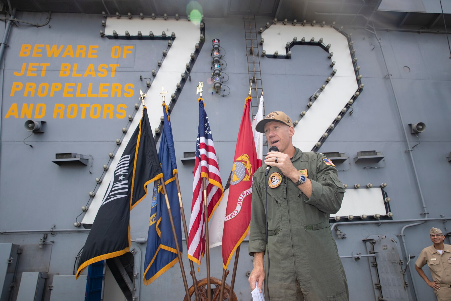 SAN DIEGO (Aug. 31, 2023) Capt. Peter Reibe, commanding officer of the Nimitz-class aircraft carrier USS Abraham Lincoln (CVN 72), speaks at an all-hands call on the flight deck. Abraham Lincoln is currently moored pier side at Naval Air Station North Island. (U.S. Navy photo by Mass Communication Specialist 3rd Class Thaddeus Berry)