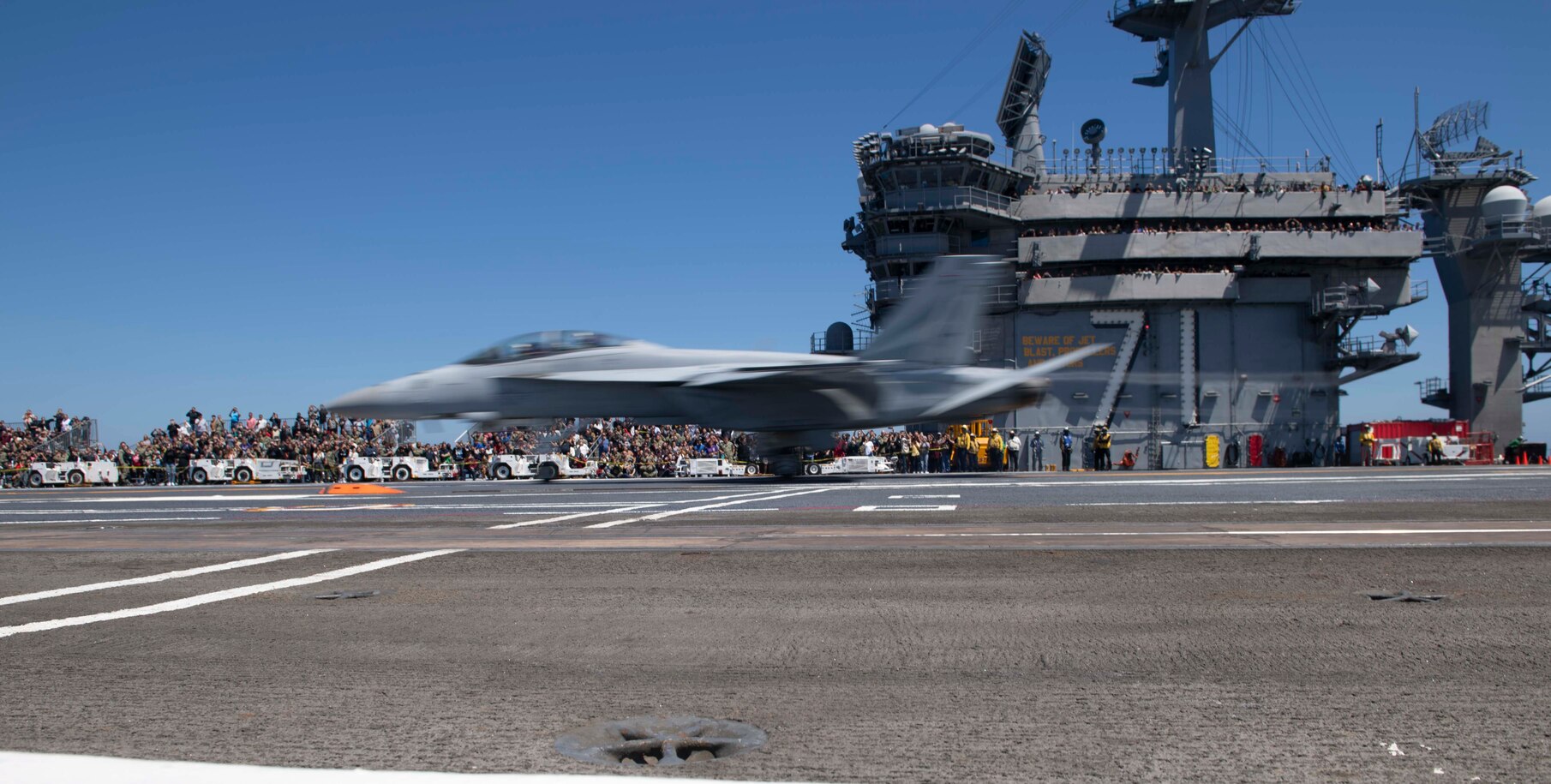 PACIFIC OCEAN (Aug. 26, 2023) An F/A-18F Super Hornet from the "Black Knights" of Strike Fighter Squadron (VFA) 154 performs a "touch and go" on the flight deck of the Nimitz-class aircraft carrier USS Theodore Roosevelt (CVN 71) during a Friends And Family Day in the Pacific Ocean, Aug. 26, 2023. Friends and family of Sailors stationed aboard Theodore Roosevelt experienced life at sea for a day during the ship's workup cycle for a deployment in 2024. (U.S. Navy photo by Mass Communication Specialist 2nd Class Alexander Panaro)
