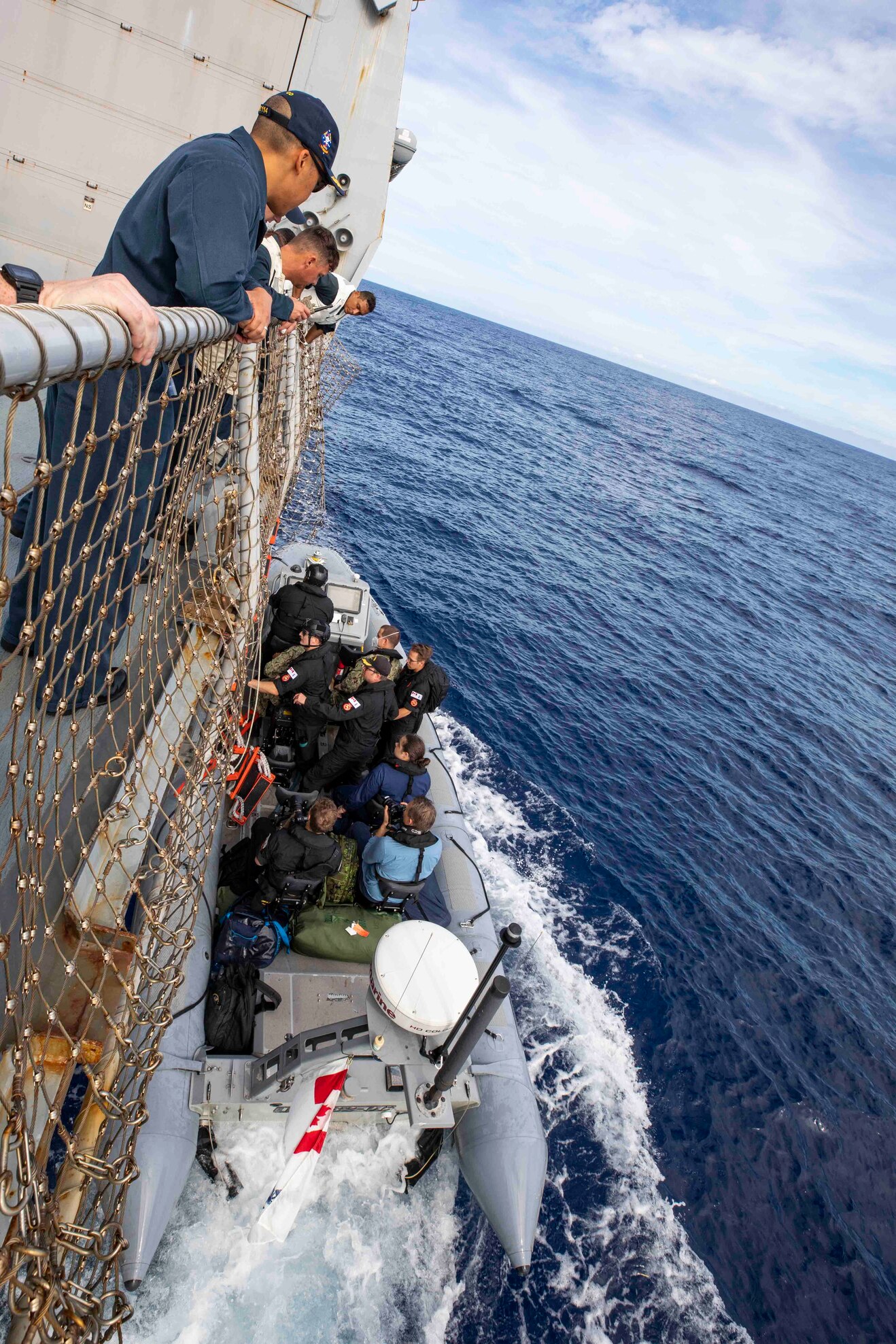 SOUTH CHINA SEA (Sept. 6, 2023) Sailors from the Royal Canadian Navy frigate HMCS Ottawa (FFH 341) pilot a rigid-hull inflatable boat to the Arleigh Burke-class guided-missile destroyer USS Ralph Johnson (DDG 114) in the South China Sea, Sept. 6, 2023. Ralph Johnson is assigned to Commander, Task Force 71/Destroyer Squadron (DESRON) 15, the Navy's largest forward-deployed DESRON and the U.S. 7th Fleet's principal surface force. (U.S. Navy photo by Mass Communication Specialist 1st Class Jamaal Liddell)