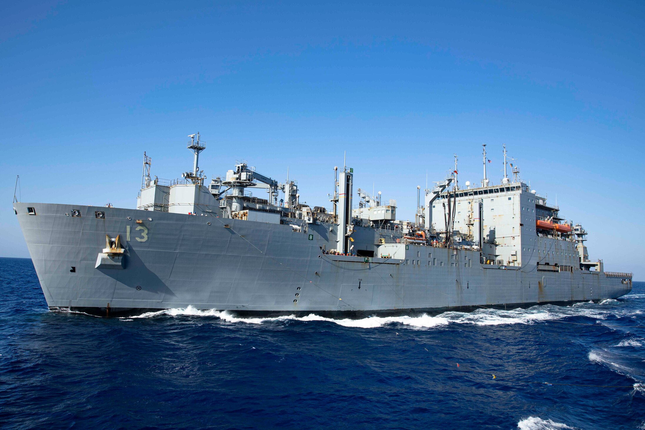 MEDITERRANEAN SEA (Aug. 23, 2023) The Lewis and Clark-class dry cargo and ammunition ship USNS Medgar Evers (T-AKE 13) conducts a replenishment-at-sea with the guided-missile cruiser USS Normandy (CG 60), Aug. 23, 2023. Normandy is part of the Gerald R. Ford Carrier Strike Group and is on a scheduled deployment in the U.S. Naval Forces Europe area of operations, employed by Sixth Fleet to defend U.S., allied, and partner interests. (U.S. Navy photo by Mass Communication Specialist 2nd Class Malachi Lakey)