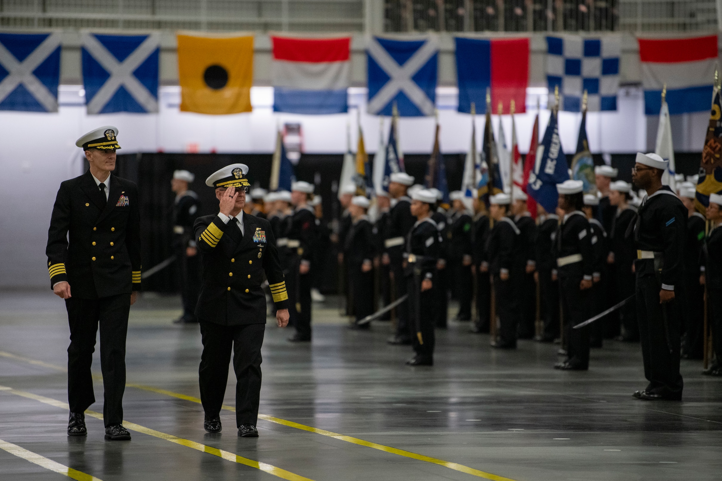 GREAT LAKES, Ill. (Oct. 5, 2023) Adm. Daryl Caudle, right, commander of U.S. Fleet Forces Command, troops the line during a pass-in-review graduation ceremony at Recruit Training Command. Boot camp is approximately 10 weeks and all enlistees into the U.S. Navy begin their careers at the command. More than 40,000 recruits train annually at the Navy's only boot camp. (U.S. Navy photo by Chief Mass Communication Specialist Brandie Nix)