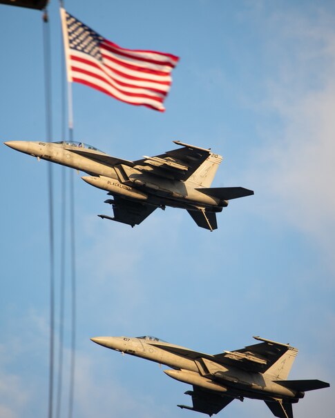 MEDITERRANEAN SEA (Oct. 13, 2023) An F/A-18F Super Hornet attached to the "Blacklions" of Strike Fighter Squadron (VFA) 213, top, and an F/A-18E Super Hornet attached to the "Ragin' Bulls" of VFA-31 fly in formation over the world's largest aircraft carrier USS Gerald R. Ford's (CVN 78) flight deck in the eastern Mediterranean Sea, Oct. 13, 2023. VFA-213 and VFA-31 are deployed aboard the Gerald R. Ford as part of Carrier Air Wing (CVW) 8. USS Gerald R. Ford is the Navy's newest and most advanced aircraft carrier, representing a generational leap in the U.S. Navy's capacity to project power on a global scale. The Gerald R. Ford Carrier Strike Group is currently operating in the Eastern Mediterranean Sea, at direction of the Secretary of Defense. The U.S. maintains forward-deployed, ready, and postured forces to deter aggression and support security and stability around the world. (U.S. Navy photo by Mass Communication Specialist 2nd Class Jackson Adkins)