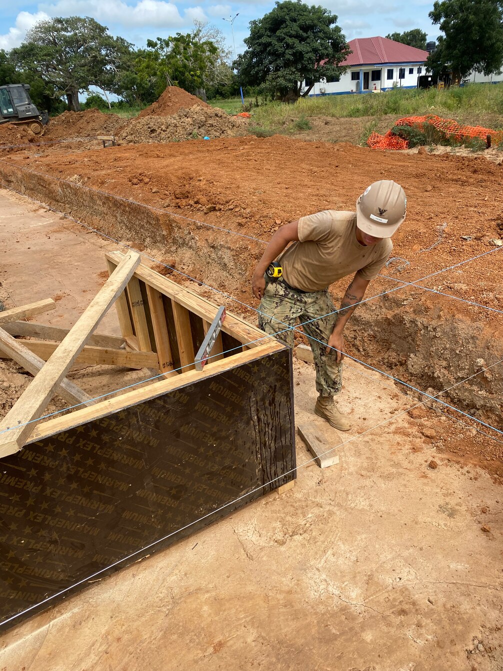 NUTEKPOR, Ghana (Oct. 11, 2023) Builder 3rd Class Alex Young, assigned to Naval Mobile Construction Battalion (NMCB) 133, inspects concrete corner forms for a tension fabric structure for a maritime training facility in Nutekpor, Ghana, Oct. 11, 2023. NMCB-133 is on a scheduled deployment in the U.S. Naval Forces Europe area of operations, employed by the U.S. 6th Fleet to defend U.S., allied and partner interests. (U.S. Navy photo by Builder 3rd Class Riley Cavalluzzo)