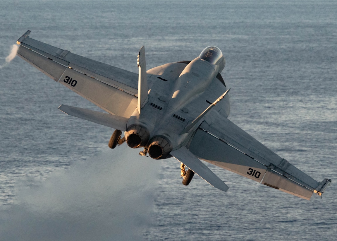 MEDITERRANEAN SEA (Oct. 20, 2023) An F/A-18E Super Hornet, attached to the "Tomcatters" of Strike Fighter Squadron (VFA) 31, launches from the flight deck of the world's largest aircraft carrier USS Gerald R. Ford (CVN 78) in the Mediterranean Sea, Oct. 20, 2023. The Gerald R. Ford Carrier Strike Group is currently operating in the Mediterranean Sea, at the direction of the Secretary of Defense. The U.S. maintains forward-deployed, ready, and postured forces to deter aggression and support security and stability around the world. (U.S. Navy photo by Mass Communication Specialist 2nd Class Nolan Pennington)