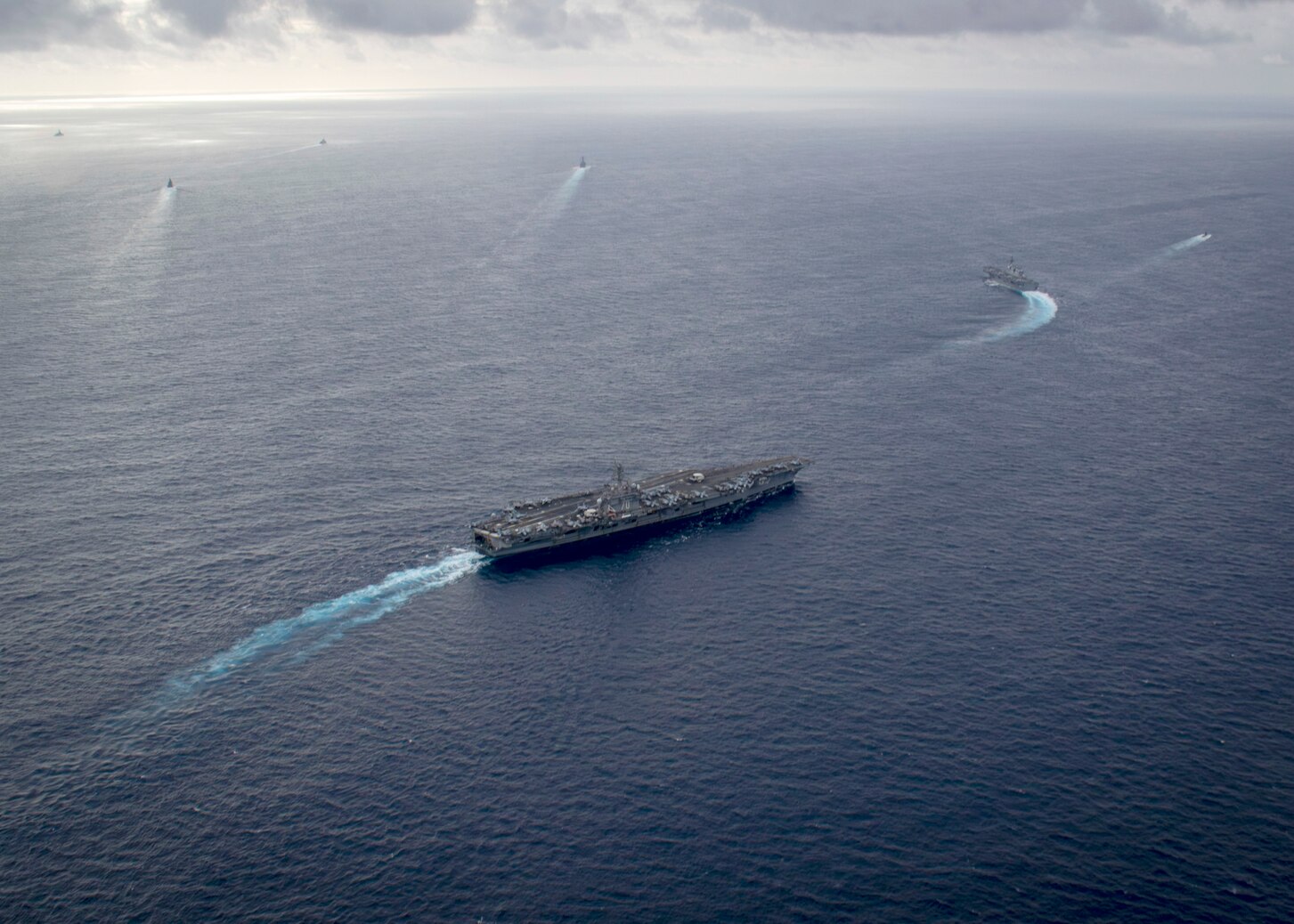 PACIFIC OCEAN (Nov. 10, 2023) The aircraft carrier USS Carl Vinson (CVN 70) transits the Pacific Ocean with ships from the Japan Maritime Self-Defense Force, Royal Australian Navy, Royal Canadian Navy and U.S. Navy ships from Carrier Strike Group 1 during Annual Exercise (ANNUALEX) 2023, Nov. 10, 2023. ANNUALEX is a multilateral exercise conducted by naval elements of the Royal Australian, Royal Canadian, Japan Maritime Self-Defense Force, and U.S. navies to demonstrate naval interoperability and a joint commitment to a free and open Indo-Pacific. Vinson, flagship of Carrier Strike Group 1, is deployed to the U.S. 7th Fleet area of operations in support of a free and open Indo-Pacific. (U.S. Navy photo by Mass Communication Specialist 3rd Class Isaiah Goessl)