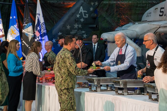 NORFOLK (Nov. 19, 2023) President Joseph R. Biden, center, and Robert Irvine serve food to families at a Friendsgiving dinner at Naval Station Norfolk, Nov. 19, 2023. Celebrity chef Irvine and members of the Robert Irvine Foundation prepared the meal for family members of Sailors aboard the aircraft carriers USS Gerald R. Ford (CVN 78) and USS Dwight D. Eisenhower (CVN 69), and single Sailors assigned to units at Naval Station Norfolk in recognition of the sacrifices they make while serving the nation, especially during the holidays. (U.S. Navy photo by Mass Communication Specialist 2nd Class Anderson W. Branch)