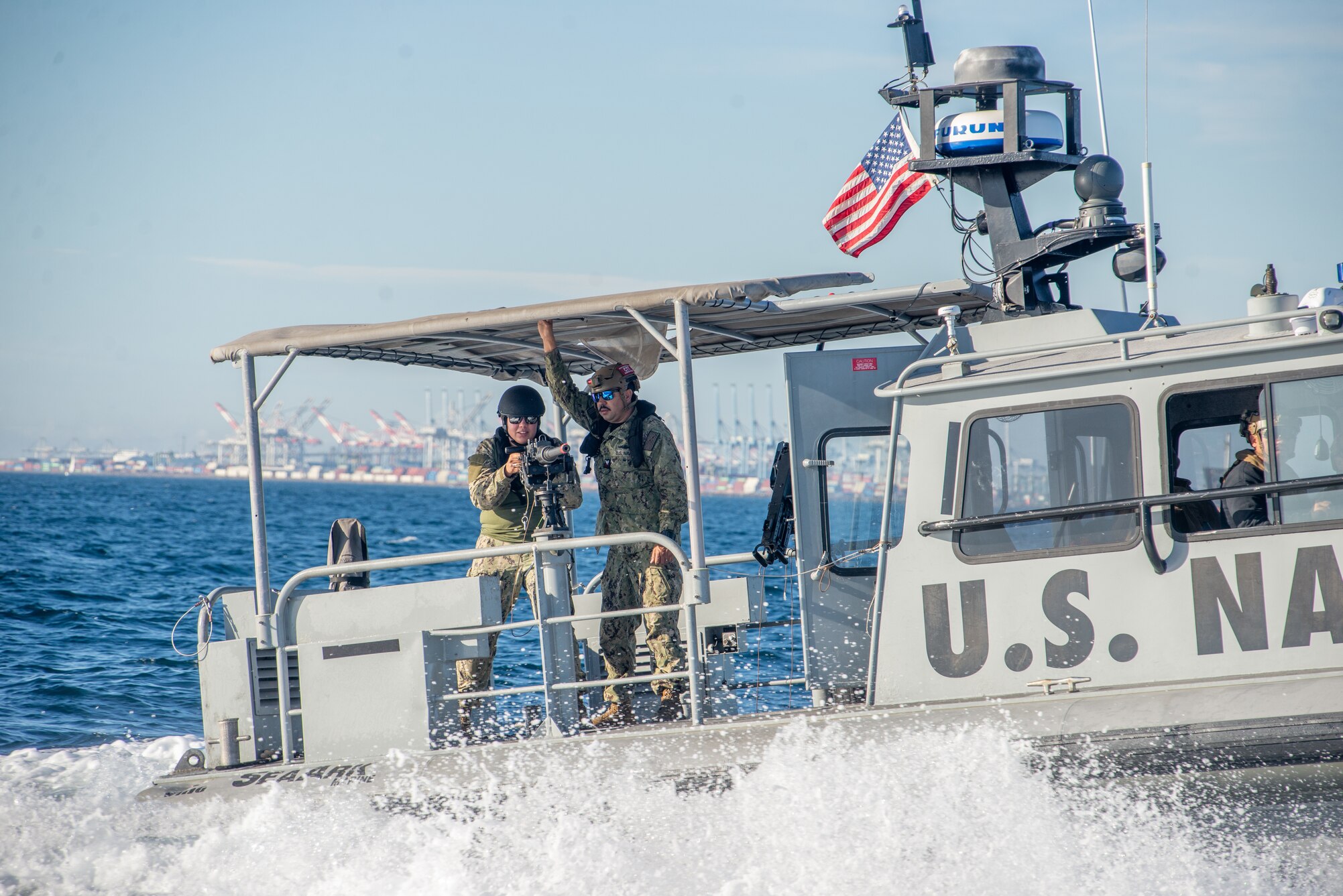 LONG BEACH, Calif. (Dec 5, 2023) Chief Personnel Specialist Zinzy Spencer rehearses procedures for operating an M2A1 .50-caliber machine gun, under instruction from Engineering 1st Class Enrique Peraza, aboard a 34-foot patrol boat assigned to Maritime Expeditionary Security Squadron (MSRON) 11 during continuum of force drills as part of Maritime Expeditionary Security Force (MESF) Boat University (BU). MESF BU is designed to train and qualify Sailors to sustain mobilization readiness. As a subcomponent of Navy Expeditionary Combat Command, the MESF is a core Navy capability that provides port and harbor security, high value asset security, and maritime security in the coastal and inland waterways. (U.S. Navy photo by Chief Boatswain�s Mate Nelson Doromal Jr.)