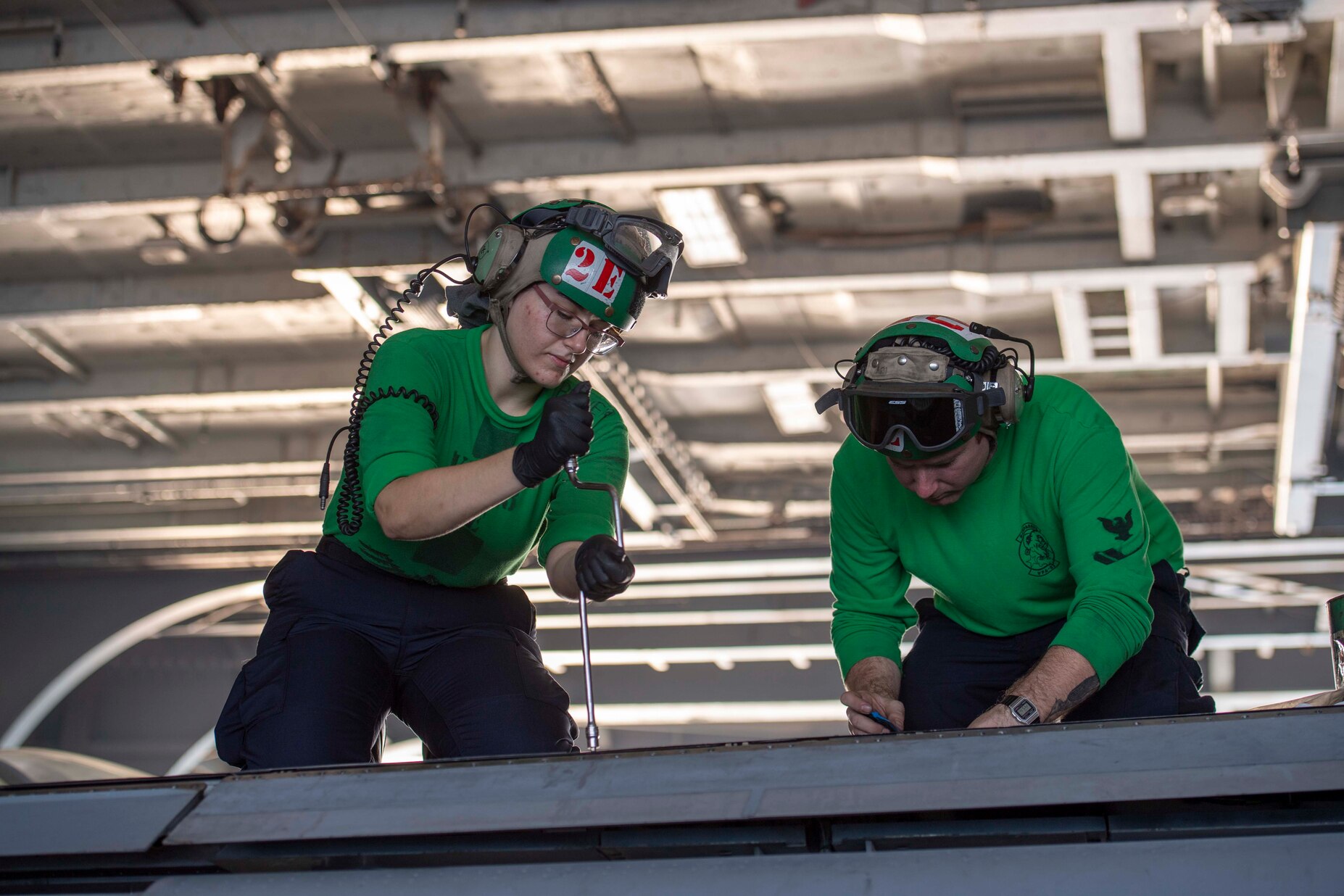ARABIAN GULF (Dec. 5, 2023) U.S. Navy Aviation Electricians Mate 3rd Class Monica Brower, left, and Aviation Electricians Mate 2nd Class Samuel Hine perform maintenance on an F/A-18E Super Hornet fighter from the "Rampagers" of Strike Fighter Squadron (VFA) 83 aboard the aircraft carrier USS Dwight D. Eisenhower (CVN 69) in the Arabian Gulf, Dec. 5, 2023. The Dwight D. Eisenhower Carrier Strike Group is deployed to the U.S. 5th Fleet area of operations to support maritime security and stability in the Middle East region. (U.S. Navy photo by Mass Communication Specialist Seaman Nicholas Rodriguez)
