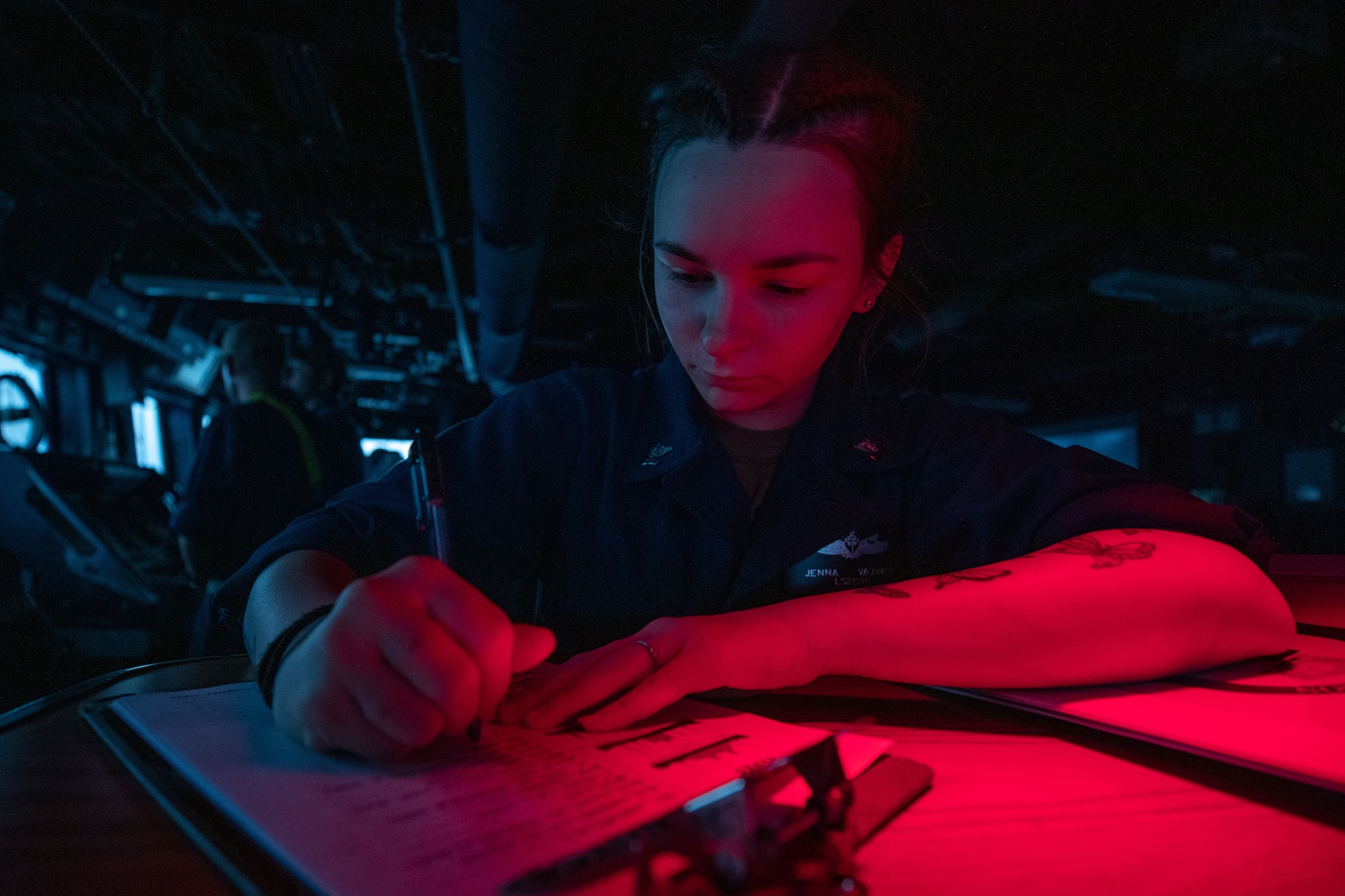 RED SEA (Dec. 26, 2023) Logistics Specialist 2nd Class Jenna Werner writes in a log book aboard the Arleigh Burke-class guided-missile destroyer USS Laboon (DDG 58) while the ship operates in support of Operation Prosperity Guardian (OPG) in the Red Sea, Dec. 26, 2023. Led by Combined Task Force 153 of the Combined Maritime Forces, OPG represents a focused, international effort to address maritime security challenges in the southern Red Sea and the Gulf of Aden, with the goal of ensuring freedom of navigation for all countries and bolstering regional security. More than 20 countries have confirmed their participation in the operation. (U.S. Navy photo by Mass Communication Specialist 2nd Class Elexia Morelos)