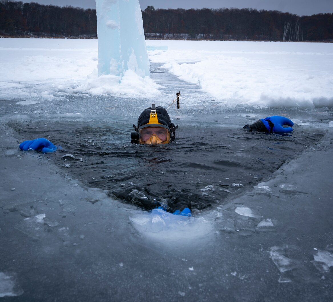 A U.S. Navy Diver assigned to Mobile Diving and Salvage Unit (MDSU) 2 ice dives in simulated arctic waters as part of Snow Crab Exercise 24-1. SNOWCRABEX is an annual exercise designed to test and evaluate U.S. Navy EOD and Navy Diver’s capabilities and equipment in a simulated arctic environment and improve combat effectiveness. Navy EOD and Navy Divers are part of the Navy Expeditionary Combat Force (NECF), enabling the U.S. Navy Fleet by clearing and protecting the battlespace. (U.S. Navy Photo by Mass Communication Specialist 1st Class Jacob D. Bergh/Released)