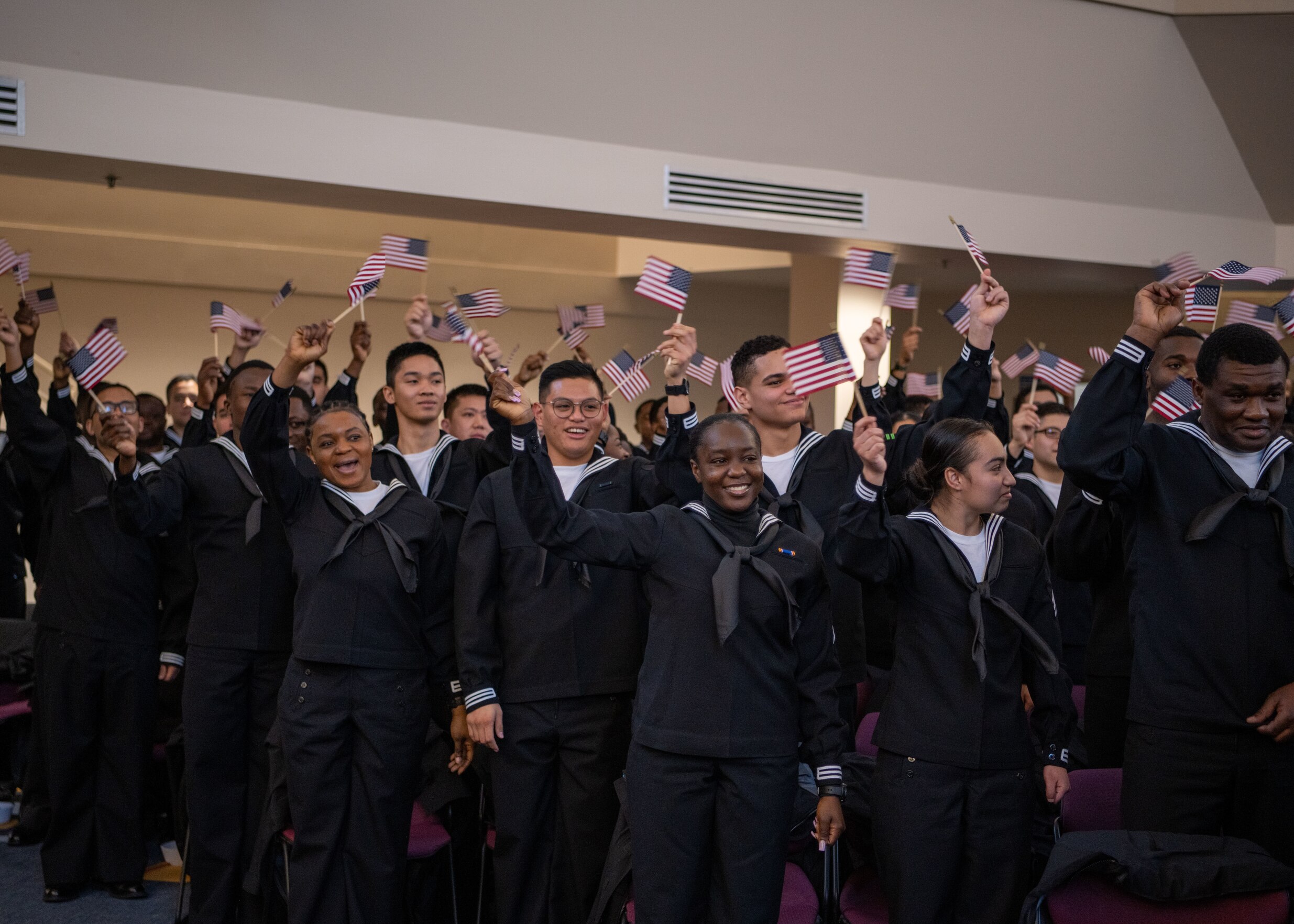 GREAT LAKES, Ill (Feb. 1, 2024) Recruits take the Oath of Allegiance during a naturalization ceremony inside the Recruit Memorial Chapel at Recruit Training Command. More than 40,000 recruits train annually at the Navy's only boot camp. (U.S. Navy photo by Mass Communication Specialist 2nd Class Stuart Posada)