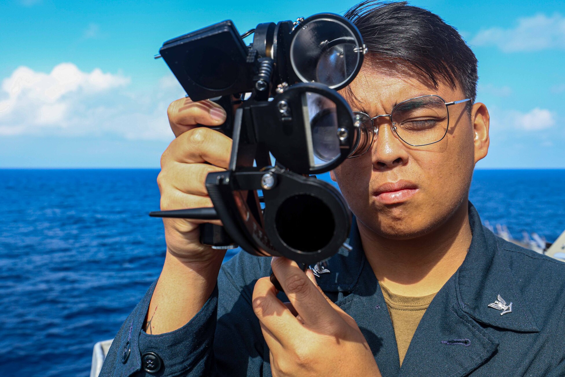 SOUTH CHINA SEA (Feb. 7, 2024) Quartermaster 3rd Class Kimdale Stallman, from Fort Worth, Texas, uses the sextant aboard the Arleigh Burke-class guided-missile destroyer USS John Finn (DDG 113) while sailing with the Japan Maritime Self-Defense Force destroyer JS Sazanami (DD 113) and Royal Australian Navy frigate HMAS Warramunga (FFH 152) during trilateral operations in the South China Sea, Feb. 7, 2024. John Finn is forward-deployed and assigned to Commander, Task Force (CTF) 71/Destroyer Squadron (DESRON) 15, the Navy's largest DESRON and the U.S. 7th Fleet's principal surface force. (U.S. Navy photo by Mass Communication Specialist 2nd Class Justin Stack)