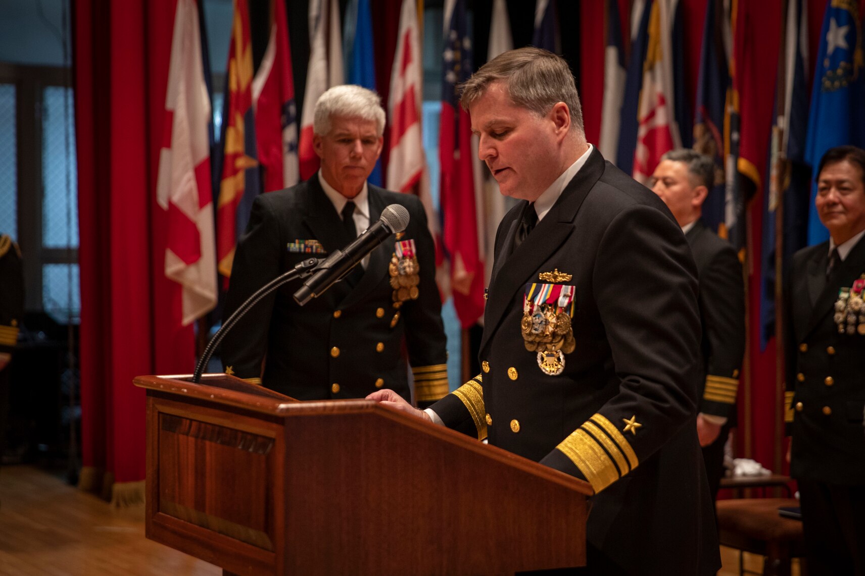 FLEET ACTIVITIES YOKOSUKA, Japan (Feb. 15, 2024) Vice Adm. Fred Kacher reads his orders to assume command of U.S. 7th Fleet during the U.S. 7th Fleet change of command ceremony at Fleet Activities Yokosuka, Feb. 15, 2024. U.S. 7th Fleet is the U.S. Navy’s largest forward-deployed numbered fleet, and routinely interacts and operates with allies and partners in preserving a free and open Indo-Pacific region. (U.S. Navy photo by Mass Communication Specialist 1st Class Charles Oki)