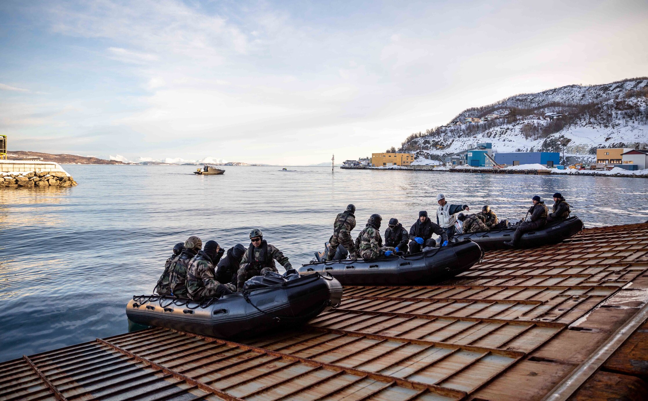 HARSTAD, Norway (Feb. 23, 2024) Members of the French navy Le Bataillon de Fusiliers Marins (BFM) Detroyat prepare to launch off the stern gate of the Whidbey Island-class dock landing ship USS Gunston Hall (LSD 44) while pier side in Harstad, Norway, Feb. 23, 2024. Gunston Hall is conducting a port visit to Harstad in support of Steadfast Defender 2024, NATO's largest exercise in decades, demonstrating NATO's ability to deploy forces rapidly from across the Alliance to reinforce the defense of Europe. (U.S. Navy photo by Mass Communication Specialist 1st Class Danielle Serocki)