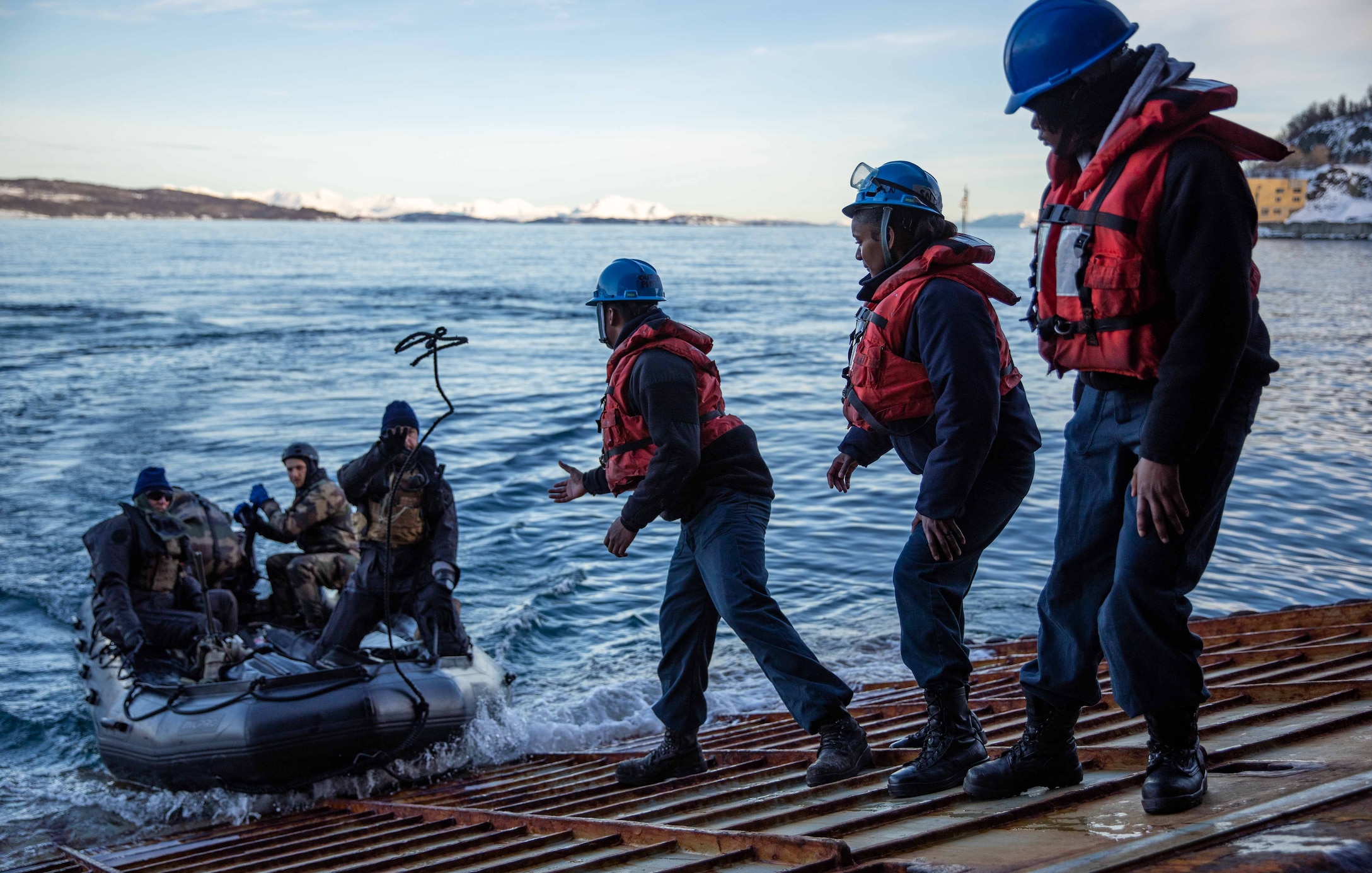 HARSTAD, Norway (Feb. 23, 2024) U.S. Navy Sailors recover a combat rubber raiding craft operated by members of the French navy Le Bataillon de Fusiliers Marins (BFM) Detroyat on the stern gate of the Whidbey Island-class dock landing ship USS Gunston Hall (LSD 44) while pier side in Harstad, Norway, Feb. 23, 2024. Gunston Hall is conducting a port visit to Harstad in support of Steadfast Defender 2024, NATO's largest exercise in decades, demonstrating NATO's ability to deploy forces rapidly from across the Alliance to reinforce the defense of Europe. (U.S. Navy photo by Mass Communication Specialist 1st Class Danielle Serocki)