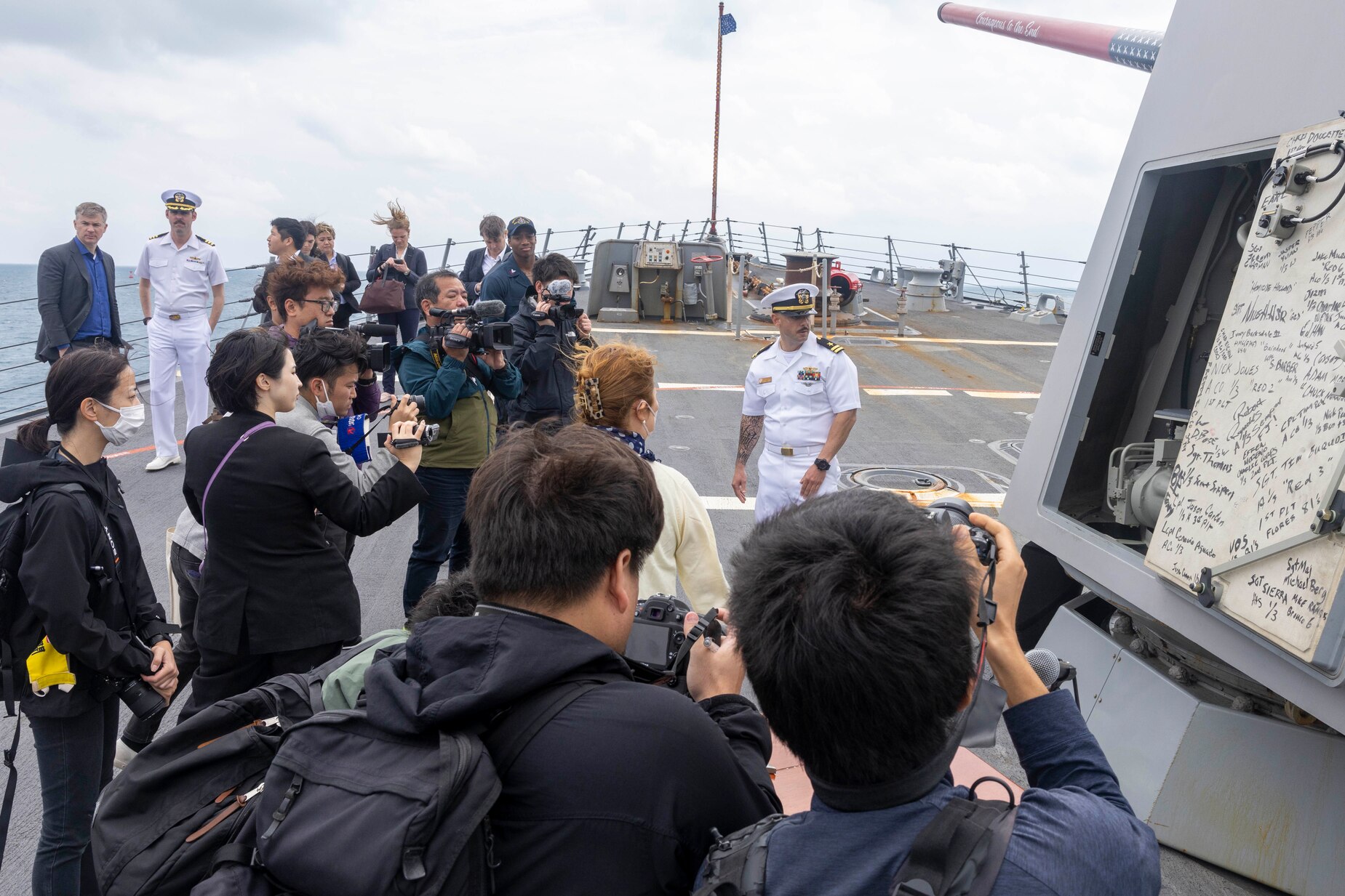 ISHIGAKI, Japan (March 11, 2024) Lt. Chris Lelah, plans and tactics officer aboard the Arleigh Burke-class guided-missile destroyer USS Rafael Peralta (DDG 115) gives local media a tour of the ship in Ishigaki, Japan during a scheduled port visit, March 11, 2024. Rafael Peralta is the first United States destroyer to visit Ishigaki. Rafael Peralta is forward-deployed and assigned to Destroyer Squadron (DESRON) 15, the Navy's largest DESRON and the U.S. 7th Fleet's principal surface force. (U.S. Navy photo by Mass Communication Specialist 1st Class Devin Monroe)