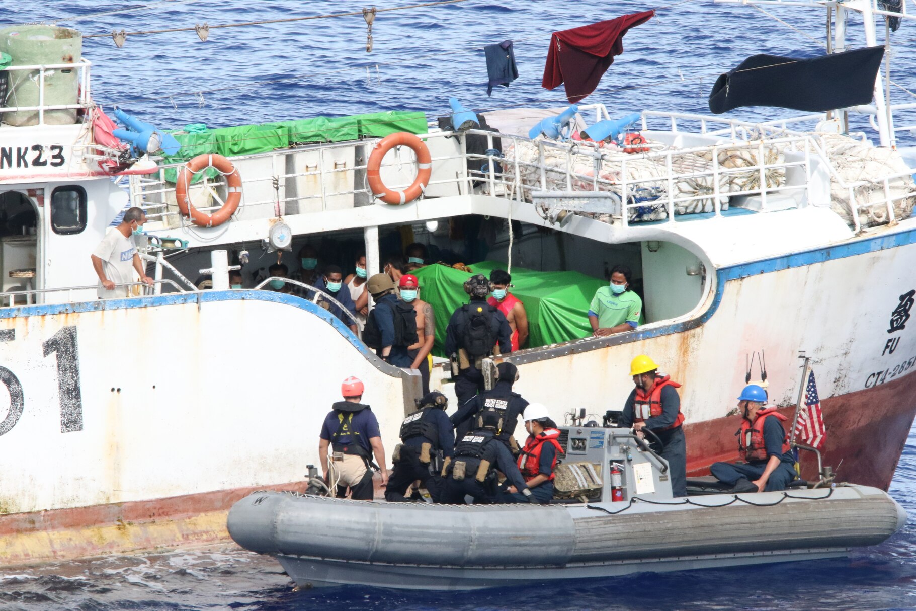 PACIFIC OCEAN (February 29, 2024) Members of the U.S. Coast Guard Law Enforcement Detachment 14 embarked aboard the Ticonderoga-class guided-missile cruiser USS Antietam (CG 54) board a foreign fishing vessel in support of Oceania Maritime Security Initiative (OMSI), February, 29, 2024. USS Antietam (CG 54) is deployed in support of the Oceania Maritime Security Initiative (OMSI) program, a Secretary of Defense program leveraging Department of Defense assets transiting the region to increase the Coast Guard's maritime domain awareness, ultimately supporting its maritime law enforcement operations in Oceania. (U.S. Navy Photo by Lt.j.g. Julia Boykin)