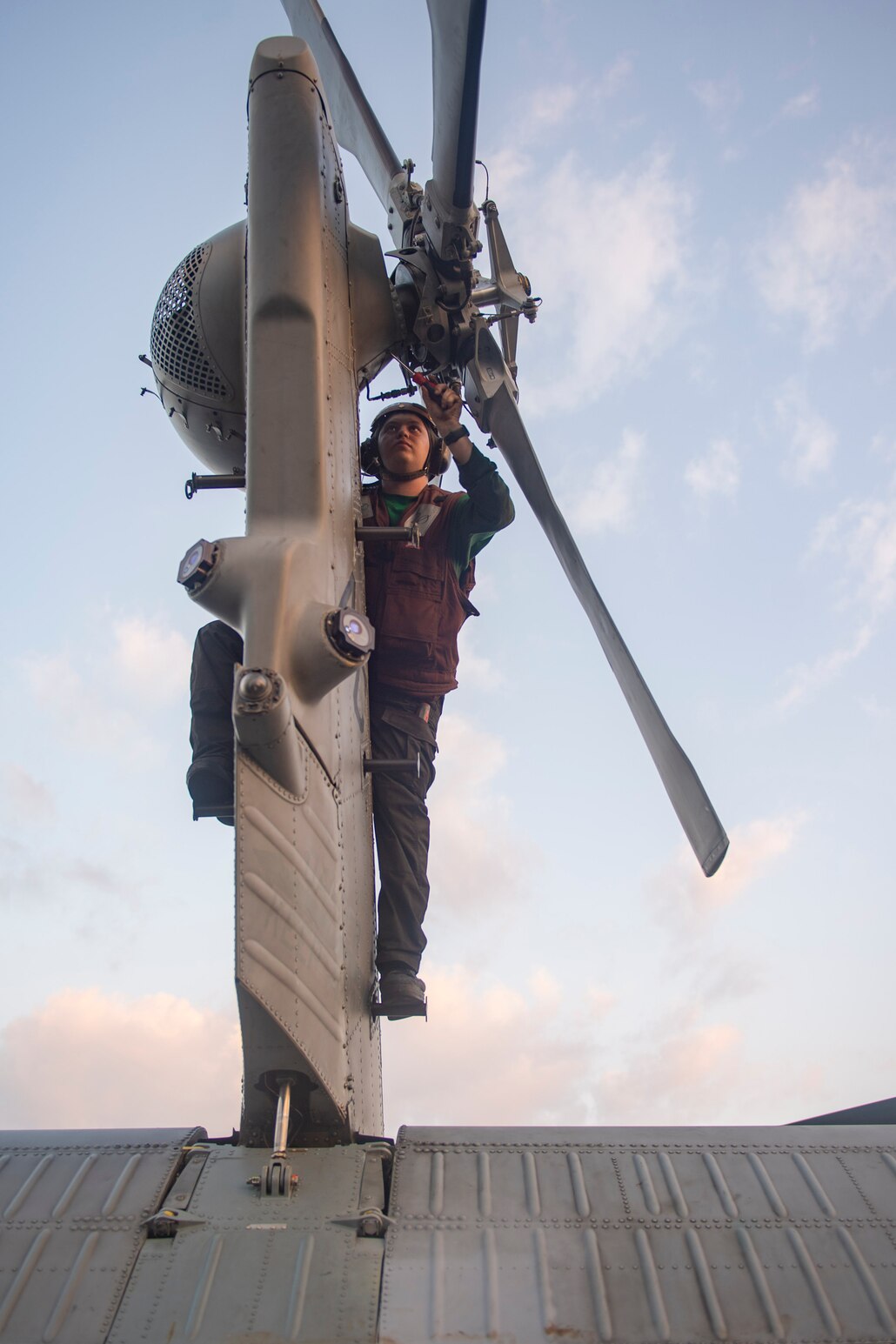 RED SEA (March 28, 2024) An Aviation Machinist's Mate conducts maintenance on an MH-60R Sea Hawk, attached to the "Swamp Foxes" of Helicopter Maritime Strike Squadron (HSM) 74, aboard the Nimitz-class aircraft carrier USS Dwight D. Eisenhower (CVN 69) in the Red Sea, March 28, 2024. The Dwight D. Eisenhower Carrier Strike Group is deployed to the U.S. 5th Fleet area of operations to support maritime security and stability in the Middle East region. (Official U.S. Navy photo)