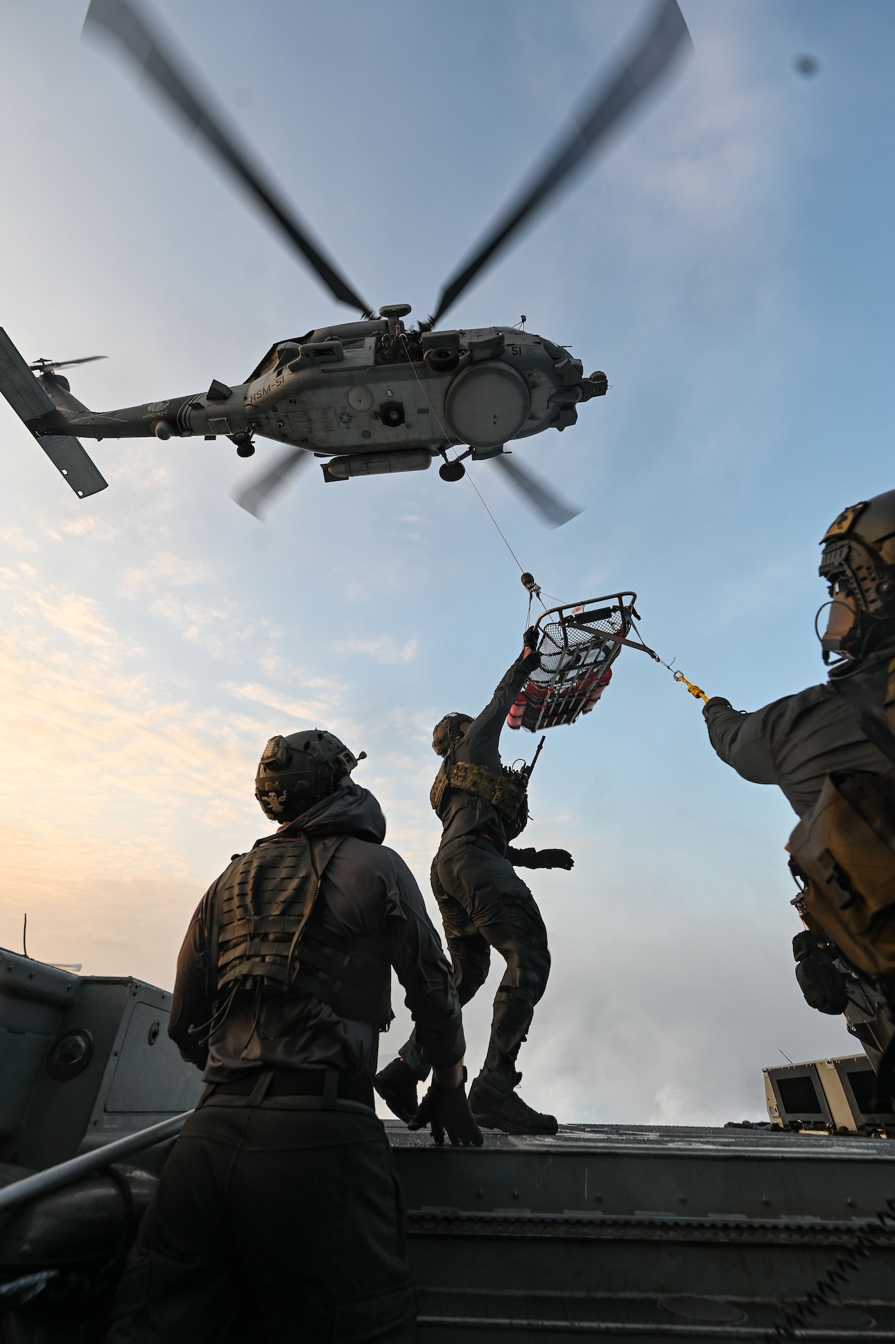 OKINAWA, Japan (March 18, 2024) Naval special warfare operators aboard a combatant craft medium guide a litter while conducting casualty evacuation training with an MH-60R assigned to the “Warlords” of Helicopter Maritime Strike Squadron (HSM) 51 off the coast of Okinawa, Japan. Naval Special Warfare is the nation's elite maritime special operations force, uniquely positioned to extend the Fleet's reach and gain and maintain access for the Joint Force in competition and conflict. (U.S. Navy photo by Mass Communication Specialist 1st Class Chelsea D. Meiller)