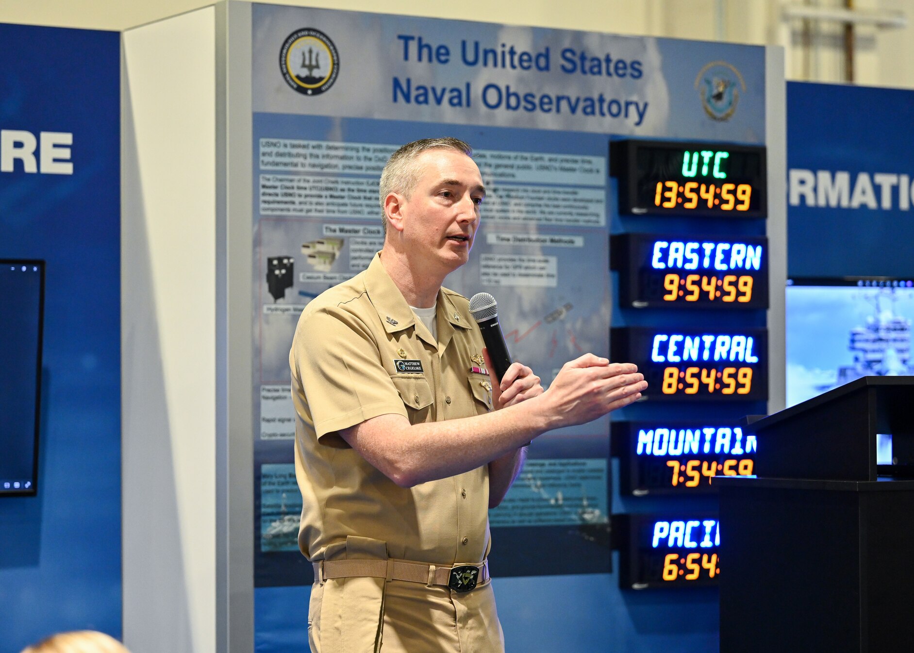 NATIONAL HARBOR, Md. (April 10, 2024) Capt. Matthew Cegelske, commanding officer of Hopper Global Communications Center, answers a question at the 2024 Sea, Air, Space Exposition at the Gaylord National Convention Center in National Harbor, Maryland, April 10, 2024. HGCC is one of five centers of excellence under the Office of Naval Intelligence. ONI is the leading provider of maritime intelligence to the U.S. Navy and joint warfighting forces, as well as national decision makers and other consumers in the Intelligence Community. (U.S. Navy photo by Erin White)