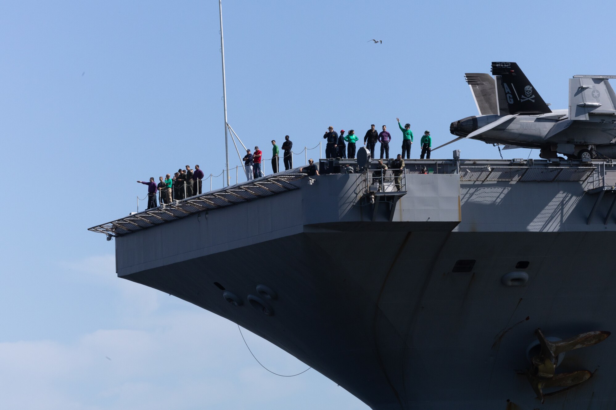 NAVAL STATION MAYPORT, Fla. (April 29, 2024) Sailors aboard the Nimitz-class aircraft carrier USS George Washington (CVN 73) await arrival at the Naval Station Mayport, April 29, 2024. George Washington is deployed as part of Southern Seas 2024 which seeks to enhance capability, improve interoperability, and strengthen maritime partnerships with countries throughout the U.S. Southern Command area of responsibility through joint, multinational and interagency exchanges and cooperation. (U.S. Navy photo by Mass Communication Specialist Seaman Jasmin L. Aquino)