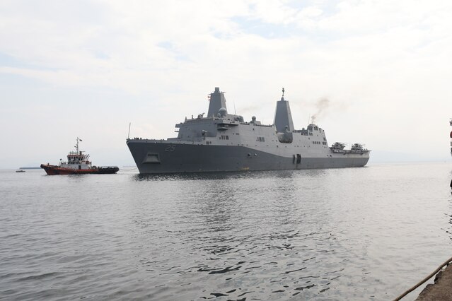 BANDAR LAMPUNG, Indonesia (May 12, 2024) The Amphibious transport dock ship USS Somerset (LPD 25) arrives at Panjang Port, in Bandar Lampung, Indonesia, for Cooperation Afloat Readiness and Training (CARAT) Indonesia 2024, May 12, 2024. This year marks the 30th iteration of CARAT, a multinational exercise series designed to enhance U.S. and partner navies' abilities to operate together in response to traditional and non-traditional maritime security challenges in the Indo-Pacific region. (U.S.Navy photo by Mass Communication Specialist 3rd Class Brett Anderson)