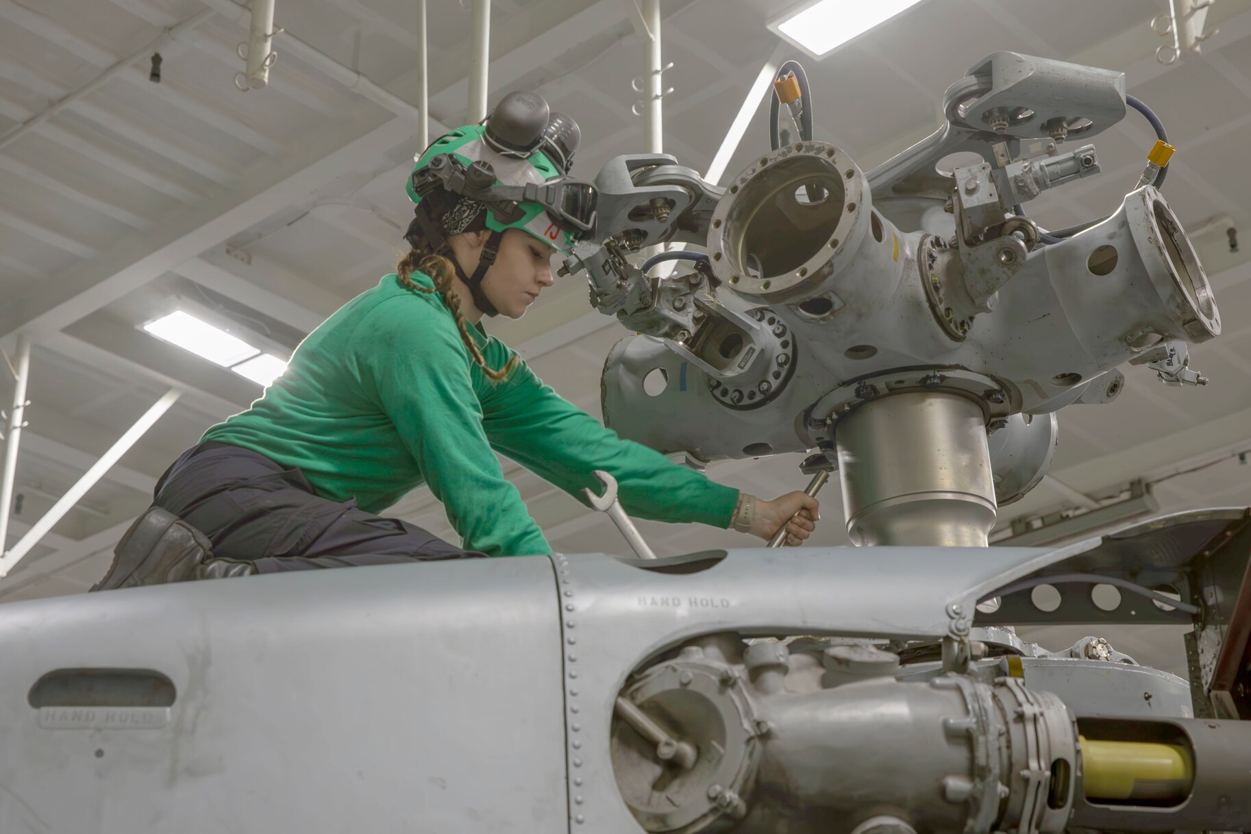PACIFIC OCEAN (May 22, 2024) Aviation Machinist’s Mate 2nd Class Christa Warren, from Oregon City, Ore., conducts maintenance on an MH-60R Sea Hawk helicopter, assigned to Helicopter Maritime Strike Squadron (HSM) 71, aboard the Nimitz-class aircraft carrier USS Abraham Lincoln (CVN 72). Abraham Lincoln, flagship of Carrier Strike Group (CSG) 3, is underway conducting integrated exercises to bolster strike group readiness and capability in the U.S. 3rd Fleet area of operations. (U.S. Navy photo by Mass Communication Specialist Seaman Joey Sitter)