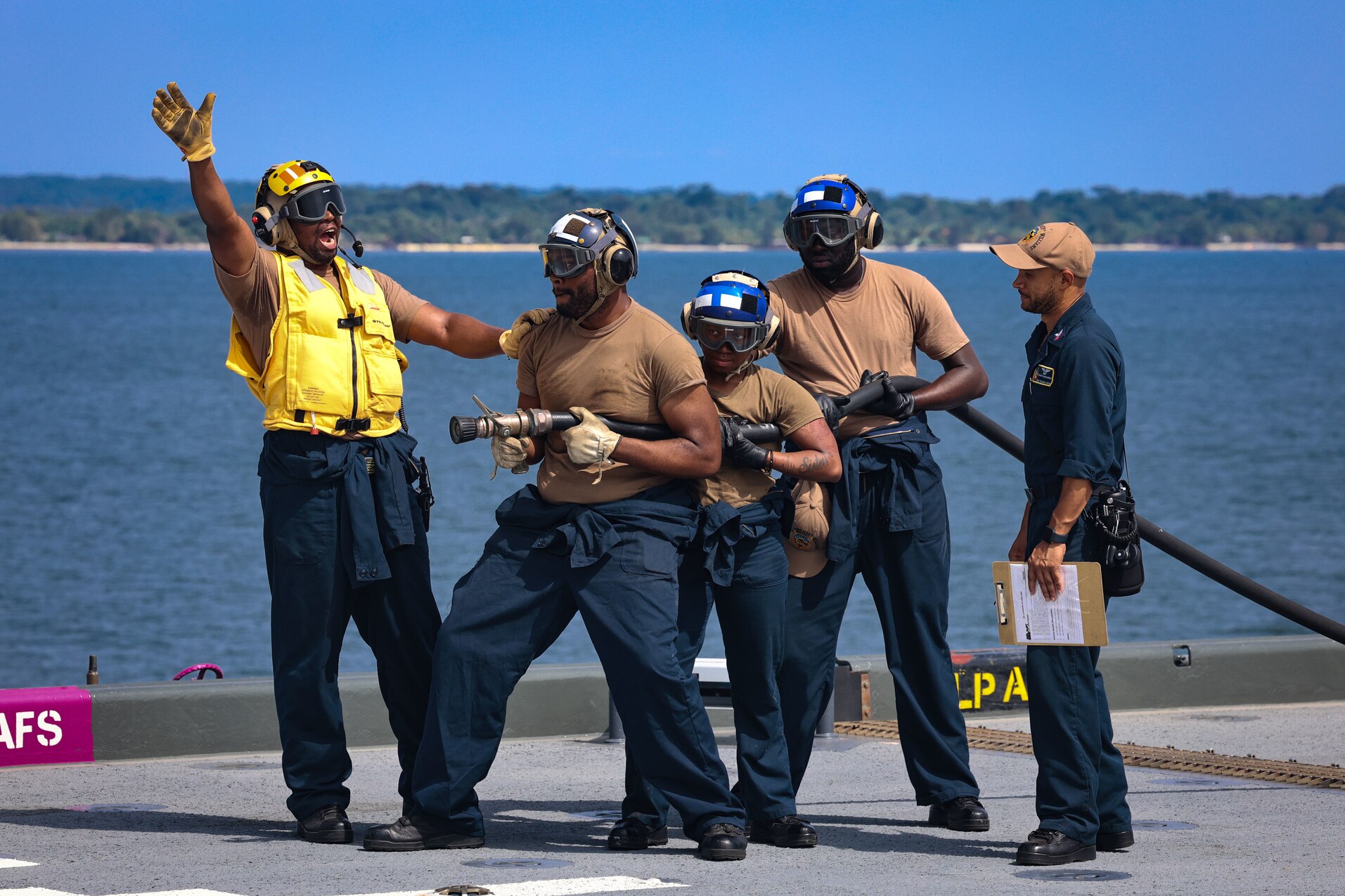 LIBREVILLE, Gabon (May 17, 2024) Sailors man the hose team during an aircraft fire drill on the flight deck of the expeditionary sea base USS Hershel "Woody" Williams (ESB 4). Hershel “Woody” Williams is on a scheduled deployment in the U.S. Naval Forces Africa area of operations, employed by U.S. Sixth Fleet to defend U.S., Allied and partner interests. (U.S. Navy photo by Ensign Glenn Field