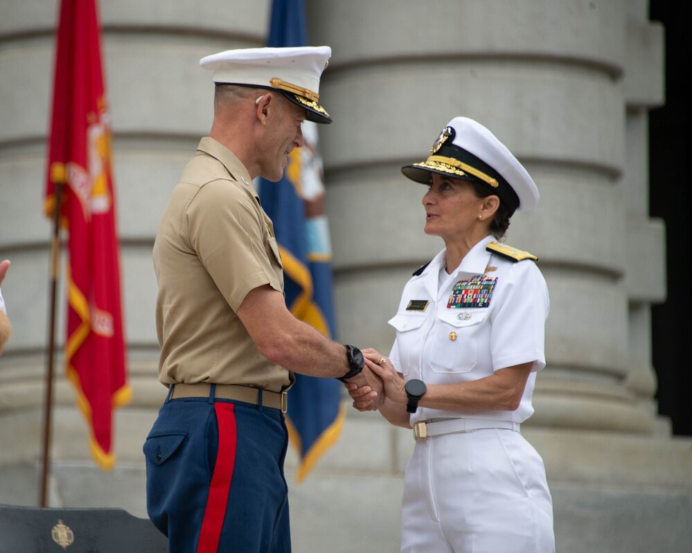 ANNAPOLIS, Md. (June 5, 2024) The U.S. Naval Academy holds the change of command ceremony in T-Court where the Commandant of Midshipmen Colonel James “J.P” McDonough III was properly relieved by Capt. Walter H. Allman III. The Naval Academy Commandant is similar to the Dean of Students at a civilian university, and is responsible for the day-to-day conduct, military training, and professional development of more than 4,400 midshipmen. As the undergraduate college of our country’s naval service, the Naval Academy prepares young men and women to become professional officers of competence, character, and compassion in the U.S. Navy and Marine Corps. (U.S. Navy photo by Stacy Godfrey)