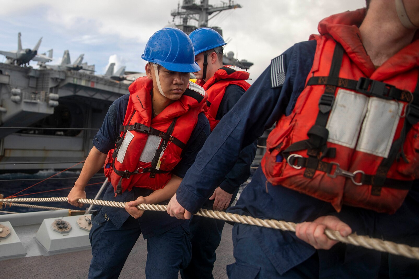 SOUTH CHINA SEA (June 11, 2024) U.S. Sailors aboard the Arleigh Burke-class guided-missile destroyer USS Ralph Johnson (DDG 114) conduct a replenishment-at-sea with the Nimitz-class aircraft carrier USS Theodore Roosevelt (CVN 71), June 11, 2024. Ralph Johnson, part of Carrier Strike Group Nine, is underway conducting routine operations in the U.S. 7th Fleet area of operations. U.S. 7th Fleet is the Navy’s largest forward-deployed numbered fleet, and routinely interacts and operates with allies and partners in preserving a free and open Indo-Pacific region. (U.S. Navy photo by Mass Communication Specialist Seaman Trevor Hale)