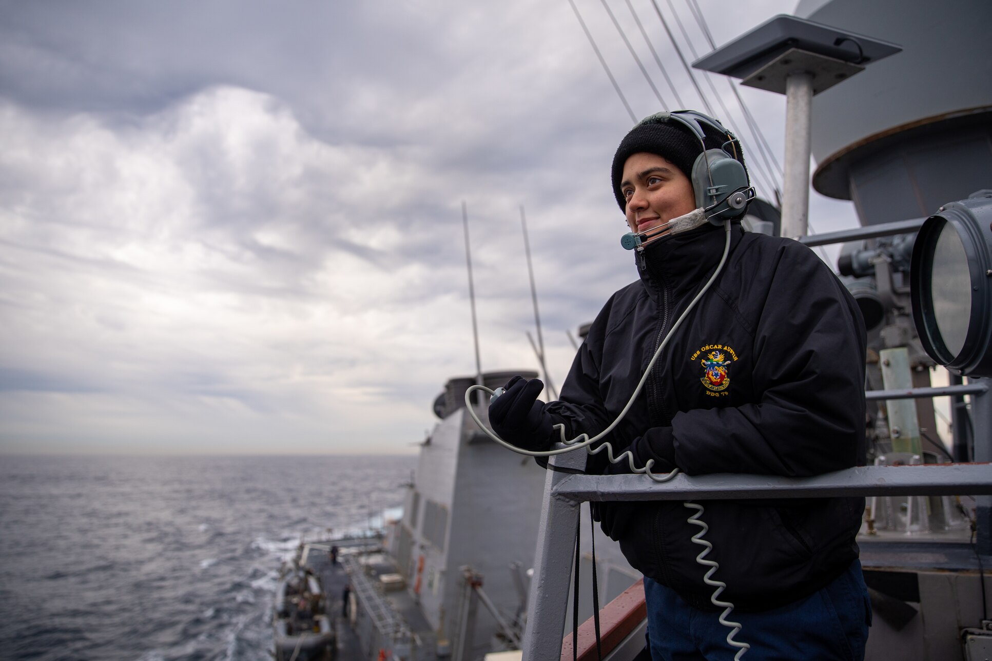 Seaman Xiomara Penaloza, from Houston, stands lookout watch aboard Arleigh Burke-class guided-missile destroyer USS Porter (DDG 78) in the Pacific Ocean, June 11, 2024. Porter is deployed as part of Southern Seas 2024 which seeks to enhance capability, improve interoperability, and strengthen maritime partnerships with countries throughout the U.S. Southern Command area of responsibility through joint, multinational and interagency exchanges and cooperation. (U.S. Navy photo by Mass Communication Specialist 2nd Class David C. Fines)